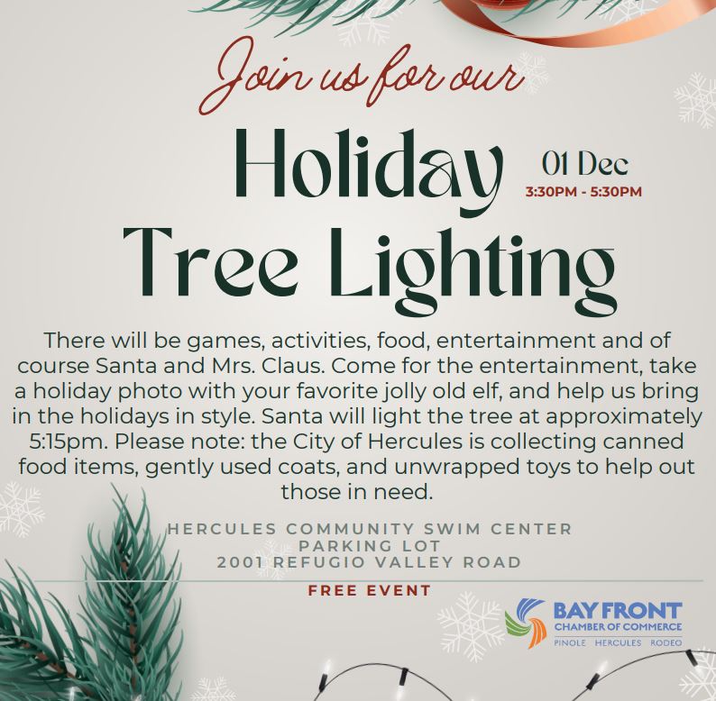 The City of Hercules will host its Annual Holiday Tree Lighting Sunday, Dec. 1, at the Hercules Community Swim Center Parking Lot at 2001 Refugio Valley Rd.