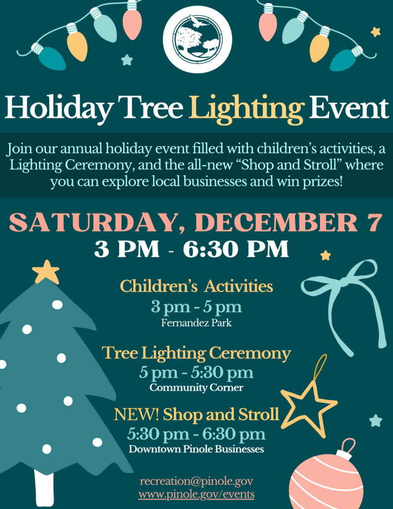 The inaugural Shop & Stroll event will take place from 5:30-6:30 pm following the Tree Lighting ceremony at Community Corner. Downtown visitors can explore participating businesses, collecting passport stamps for a chance to win prizes. It’s an opportunity to support local businesses and enjoy a festive evening in downtown Pinole, according to the city.