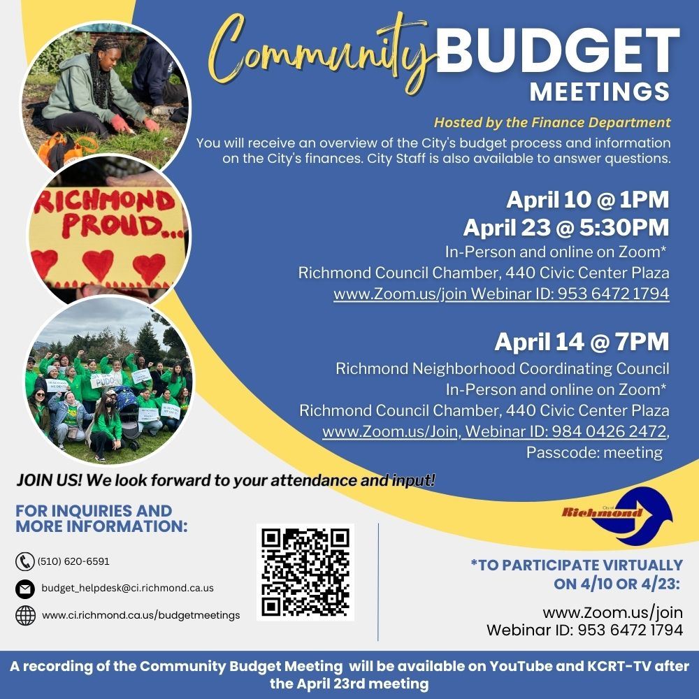 The City of Richmond Finance Department will provide an overview of the budget process and share important financial updates at a series of community meetings next month.