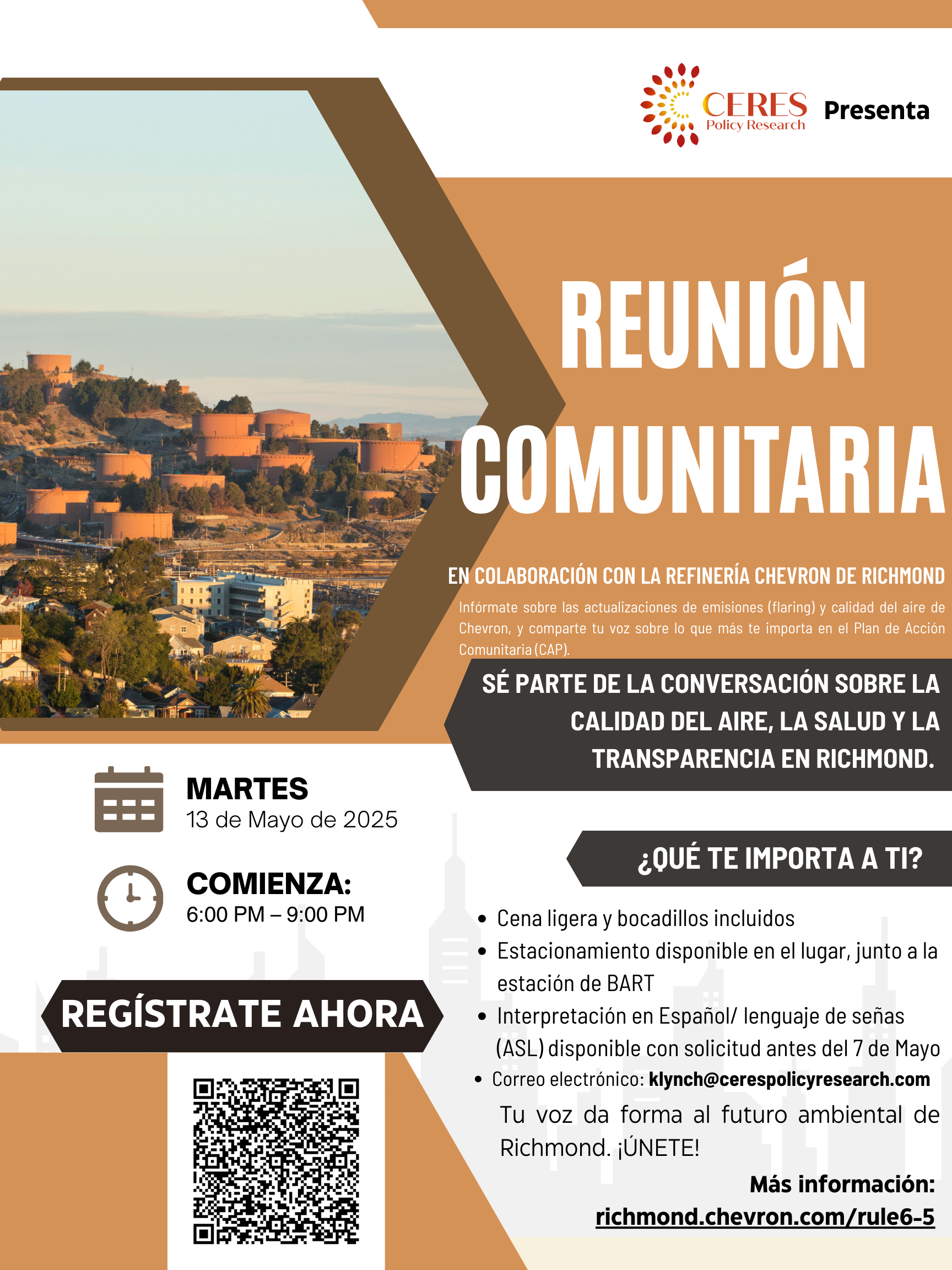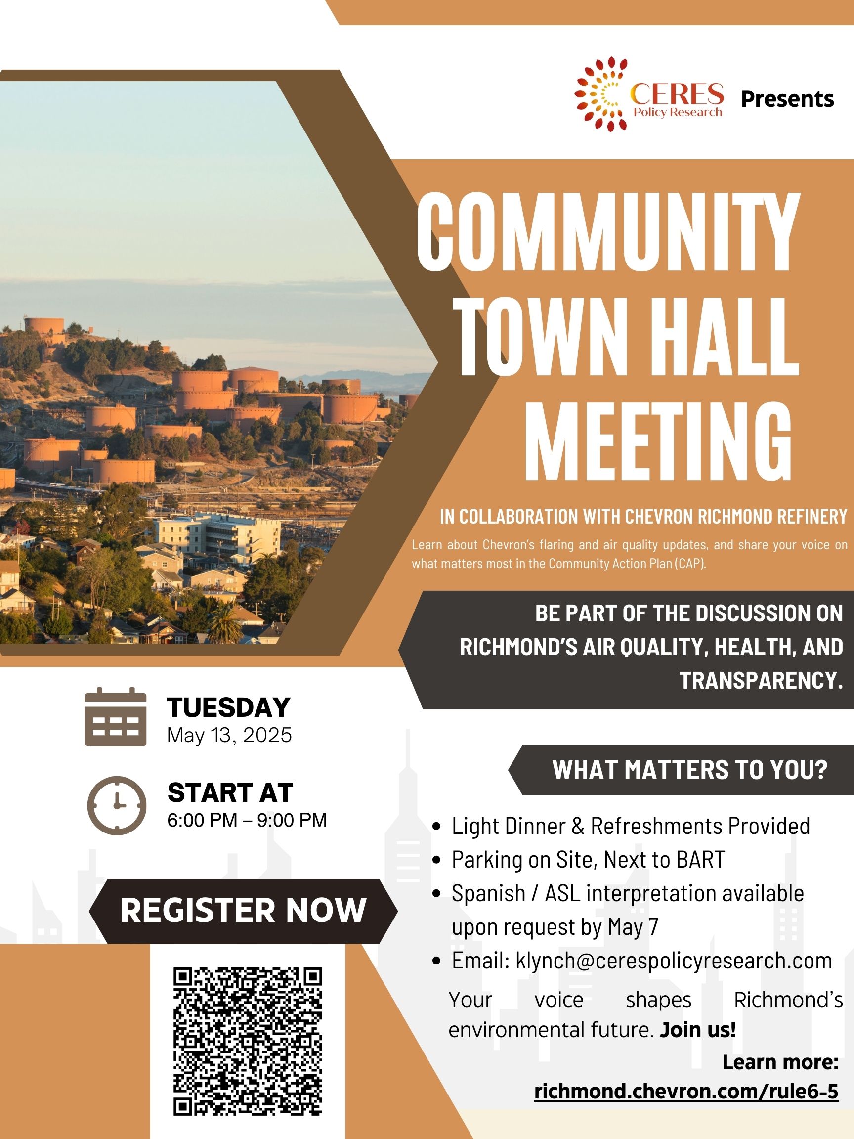 Hosted by Ceres Policy Research, the town hall will also feature interactive breakout discussions focused on real-time alerts, environmental health concerns and accountability strategies. A public comment period will enable residents to voice their experiences, ideas and concerns directly to the CAP team and Chevron Richmond representatives.