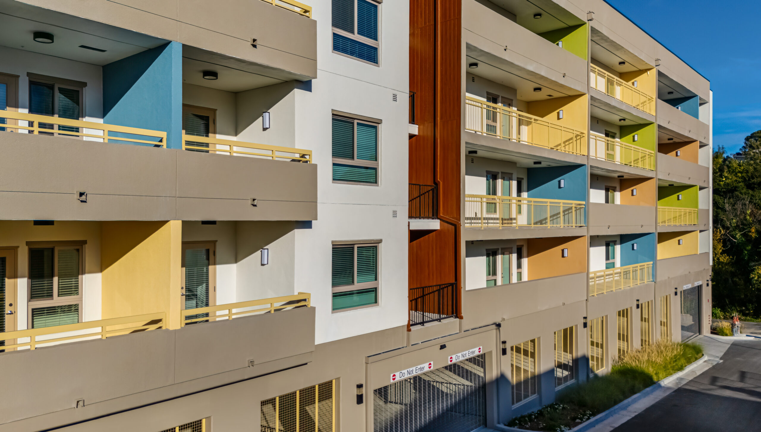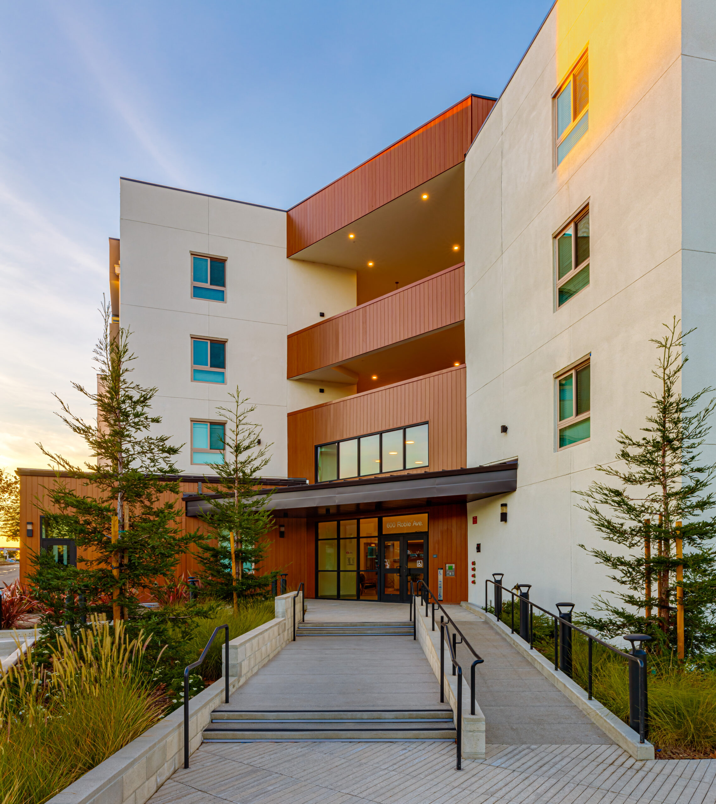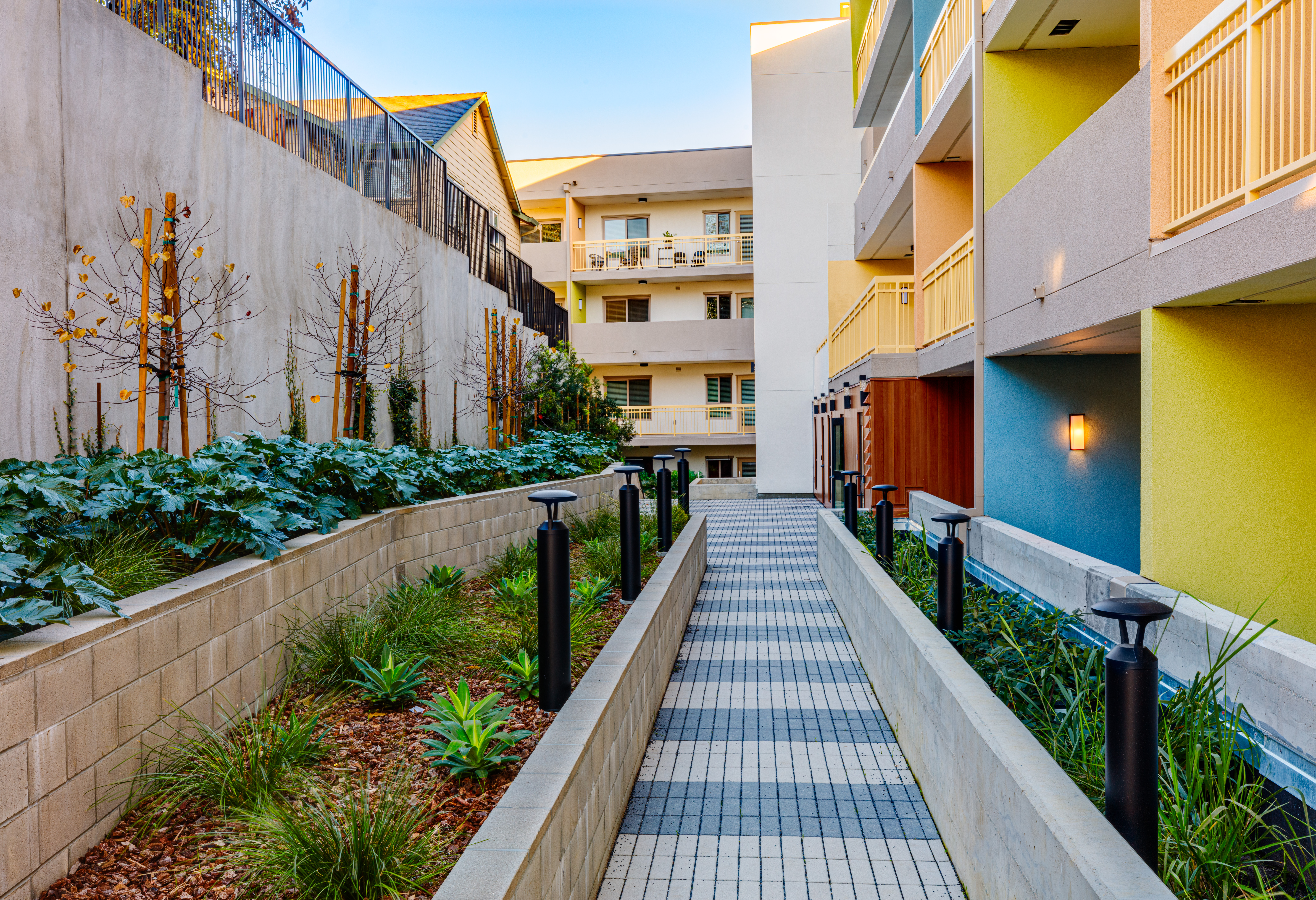 The development includes rooftop solar, drought-tolerant landscaping, EV charging stations and energy-efficient systems. A newly added bus shelter and an on-site electric ride-share program support residents with limited mobility. Landscaped outdoor spaces, a fitness room, community lounges and an entertainment area aim to foster active, social living.