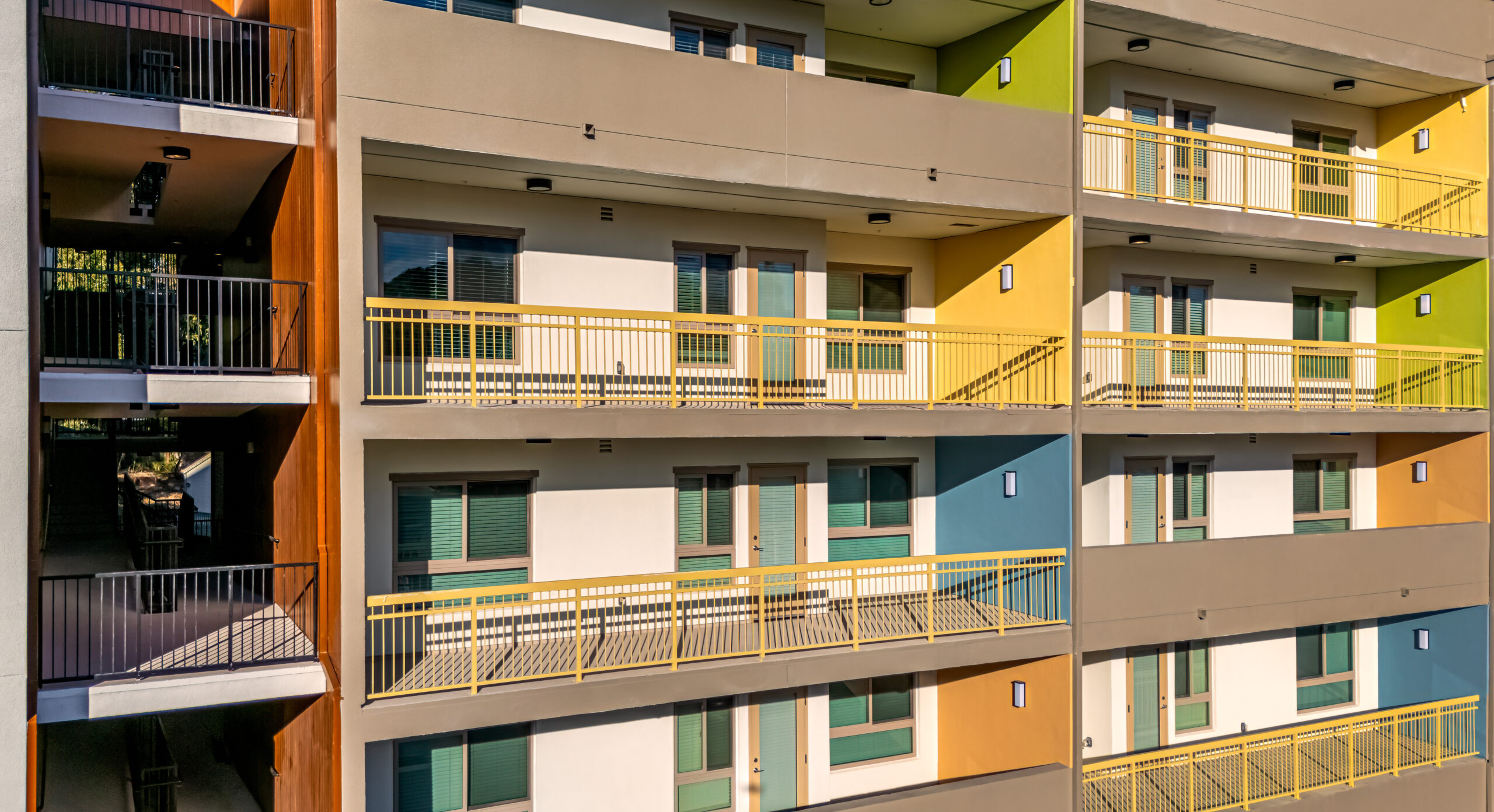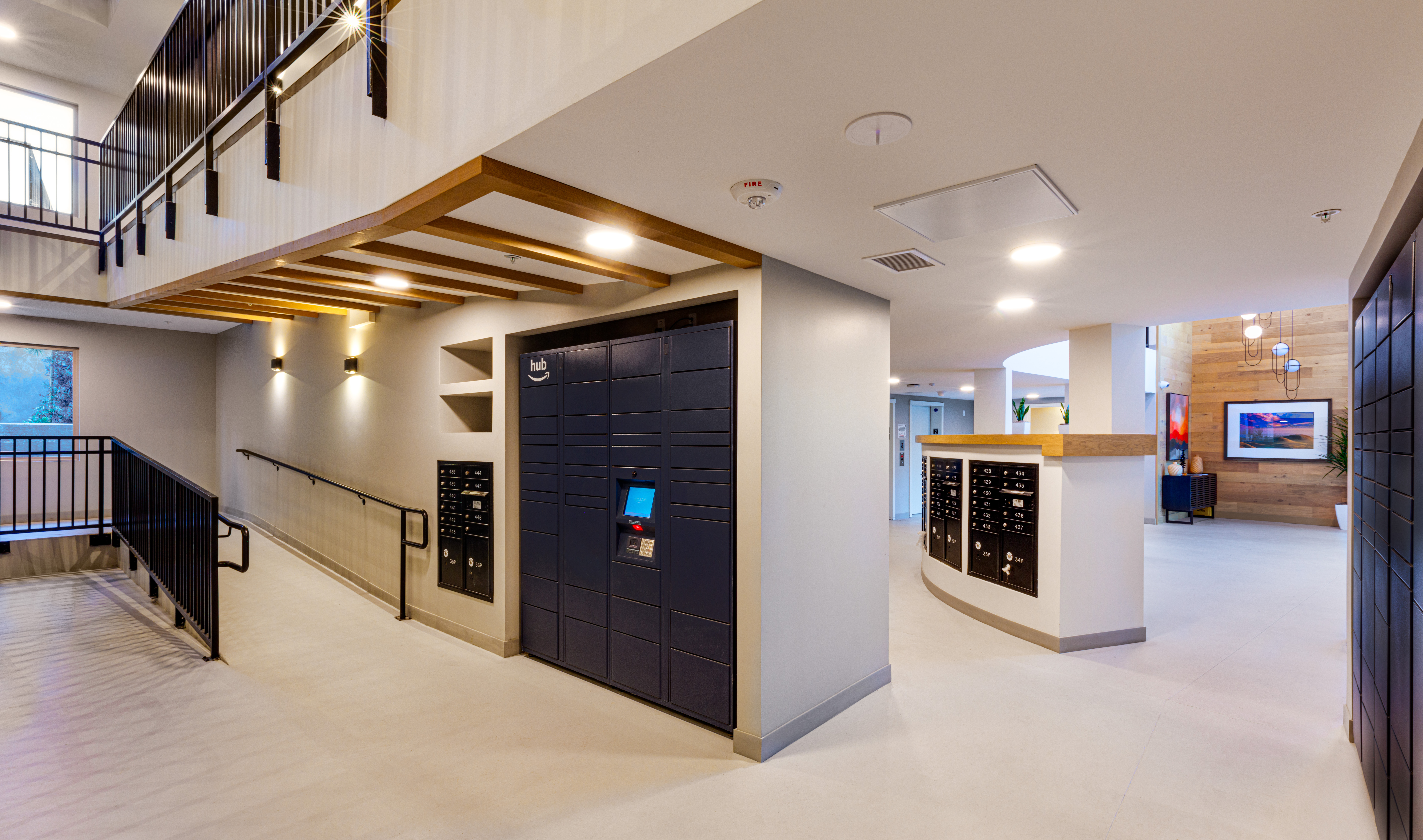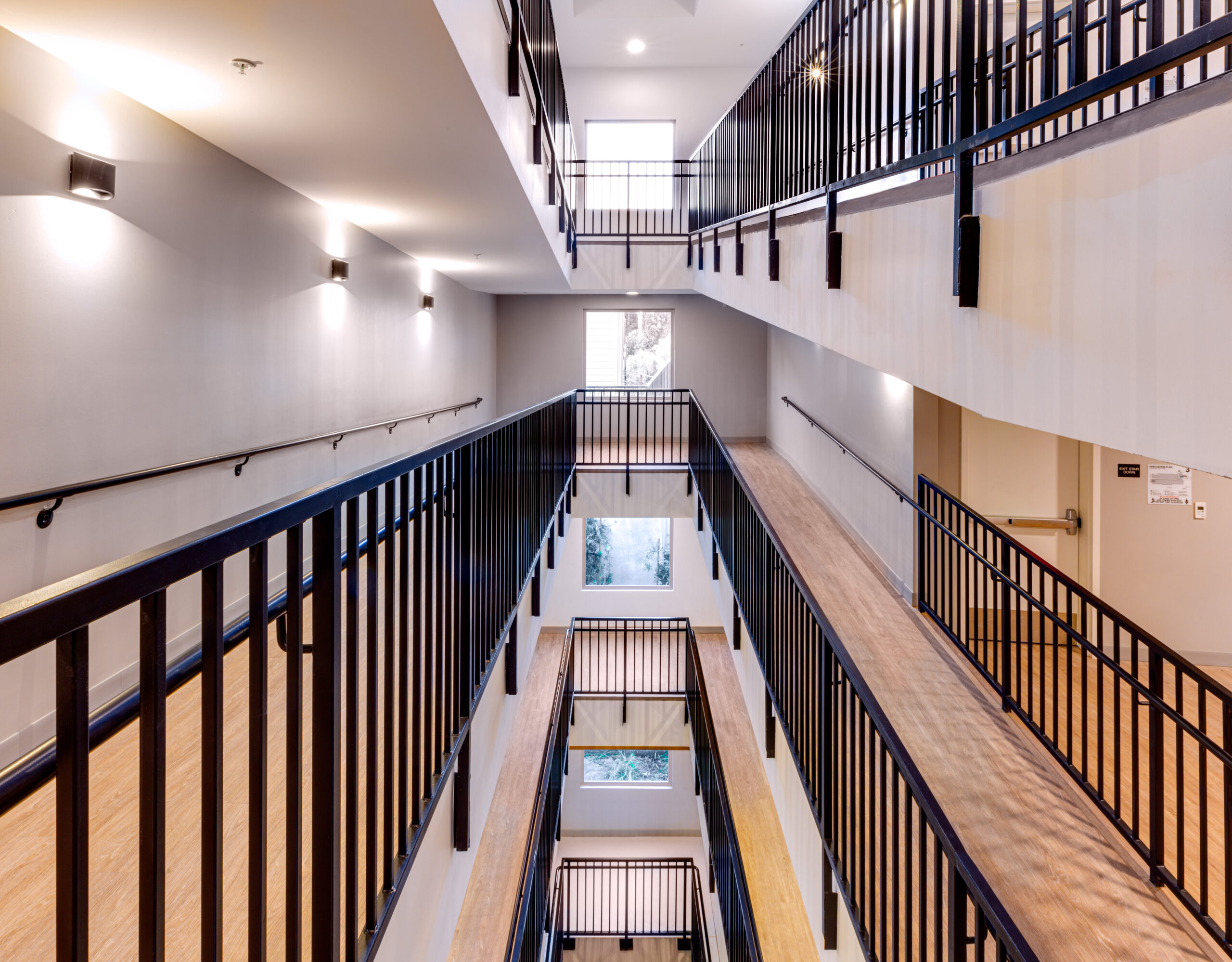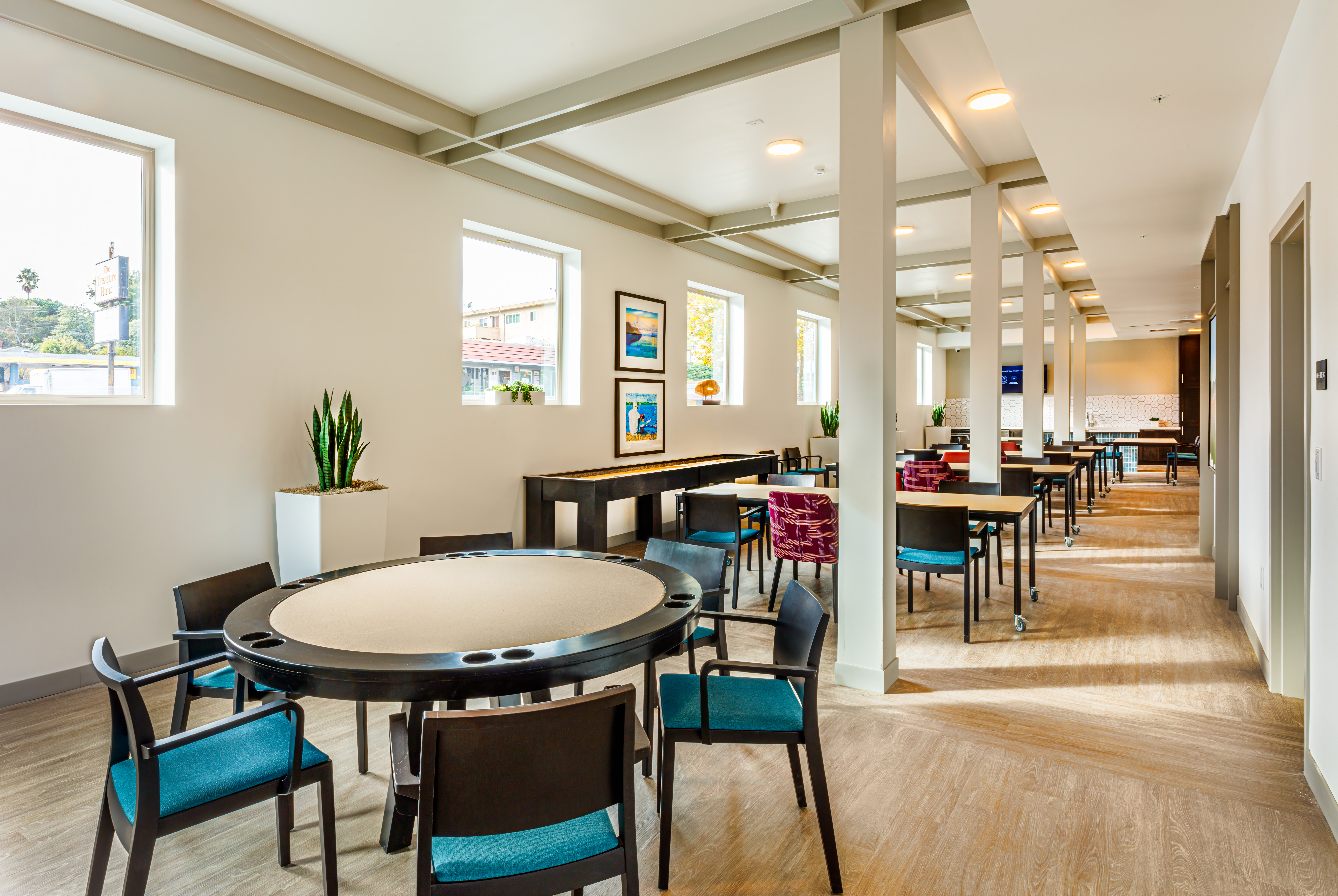 The development includes rooftop solar, drought-tolerant landscaping, EV charging stations and energy-efficient systems. A newly added bus shelter and an on-site electric ride-share program support residents with limited mobility. Landscaped outdoor spaces, a fitness room, community lounges and an entertainment area aim to foster active, social living.