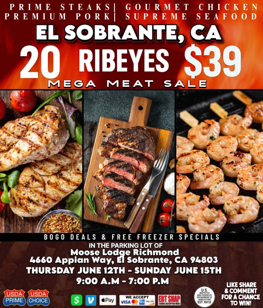 Kenston Farms, a meat wholesaler, is hosting a “Mega Meat Sale” now through Sunday, June 15 from 9 a.m. to 7 p.m. in the parking lot at the Moose Lodge in El Sobrante.