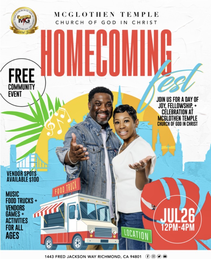 McGlothen Temple Church of God in Christ is celebrating its 100th anniversary with a “Homecoming FestSaturday, July 26, from noon to 4 p.m. at its home at 1443 Fred Jackson Way in North Richmond.