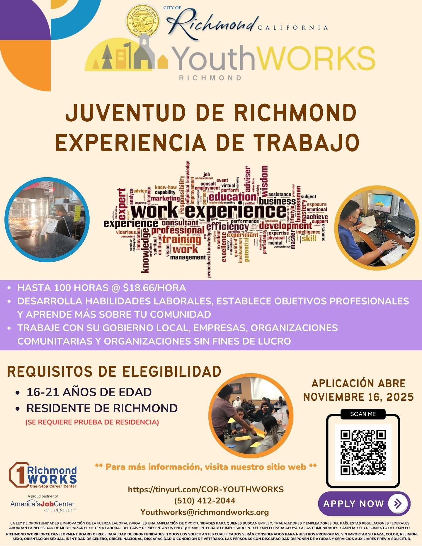 To apply, fill out the online form at tinyurl.com/WorkExperience-Appl, which redirects to the YouthWORKS application portal. For questions, call (510) 412-2044 or email [email protected].