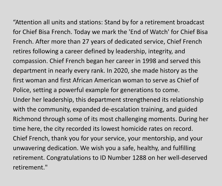 After 27 years of protecting the streets of Richmond, Chief Bisa French has officially hung up her badge. Her final “End of Watch” ceremony last week marked the close of a historic career.