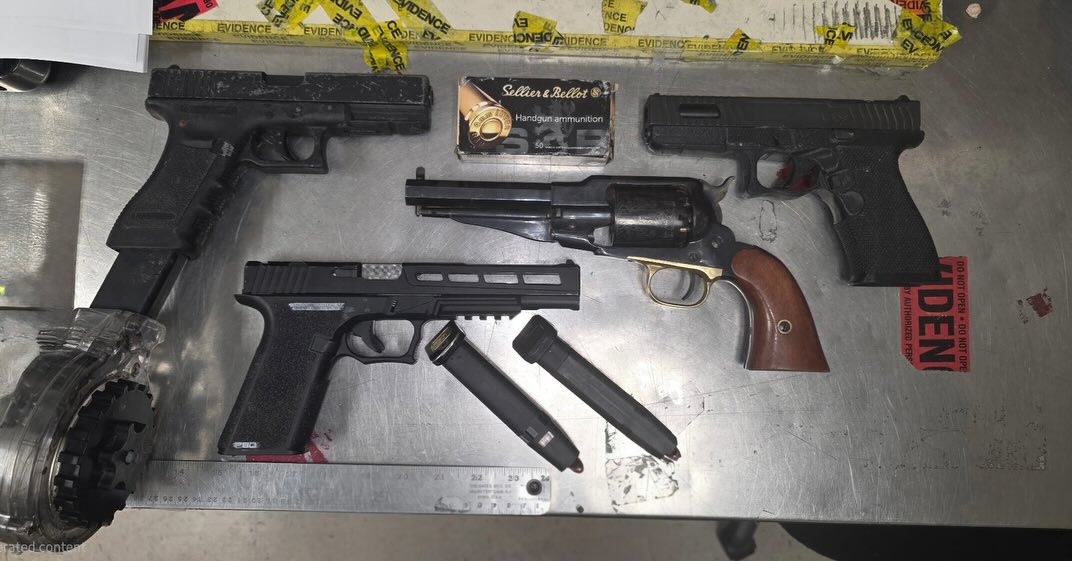 As the suspect exited the vehicle, officers said they located two loaded firearms sitting directly next to the driver’s seat. A subsequent search of the interior revealed two additional loaded firearms. All four weapons were positioned within easy reach of the driver.