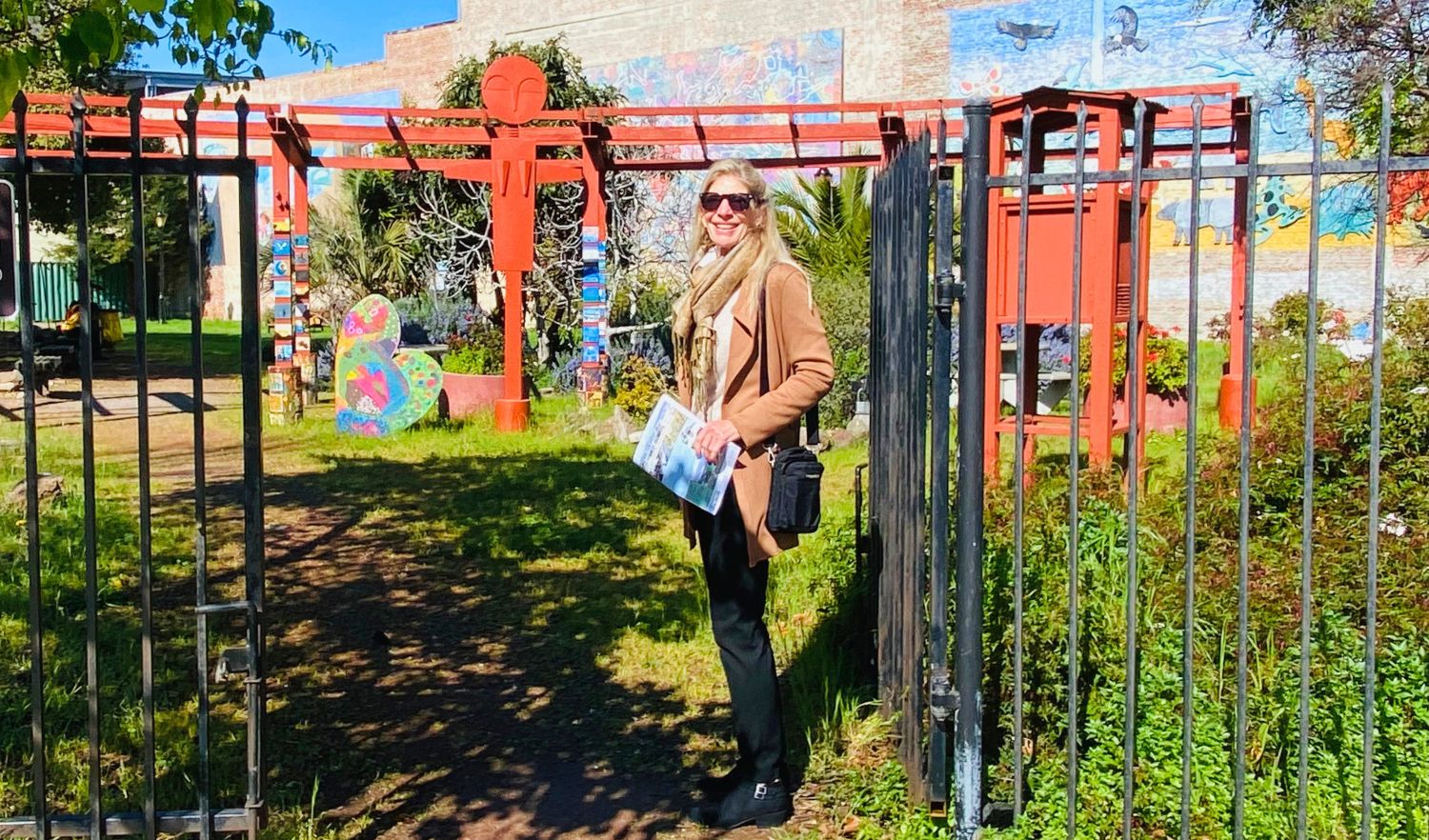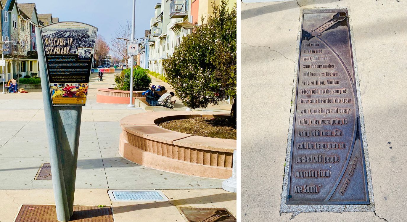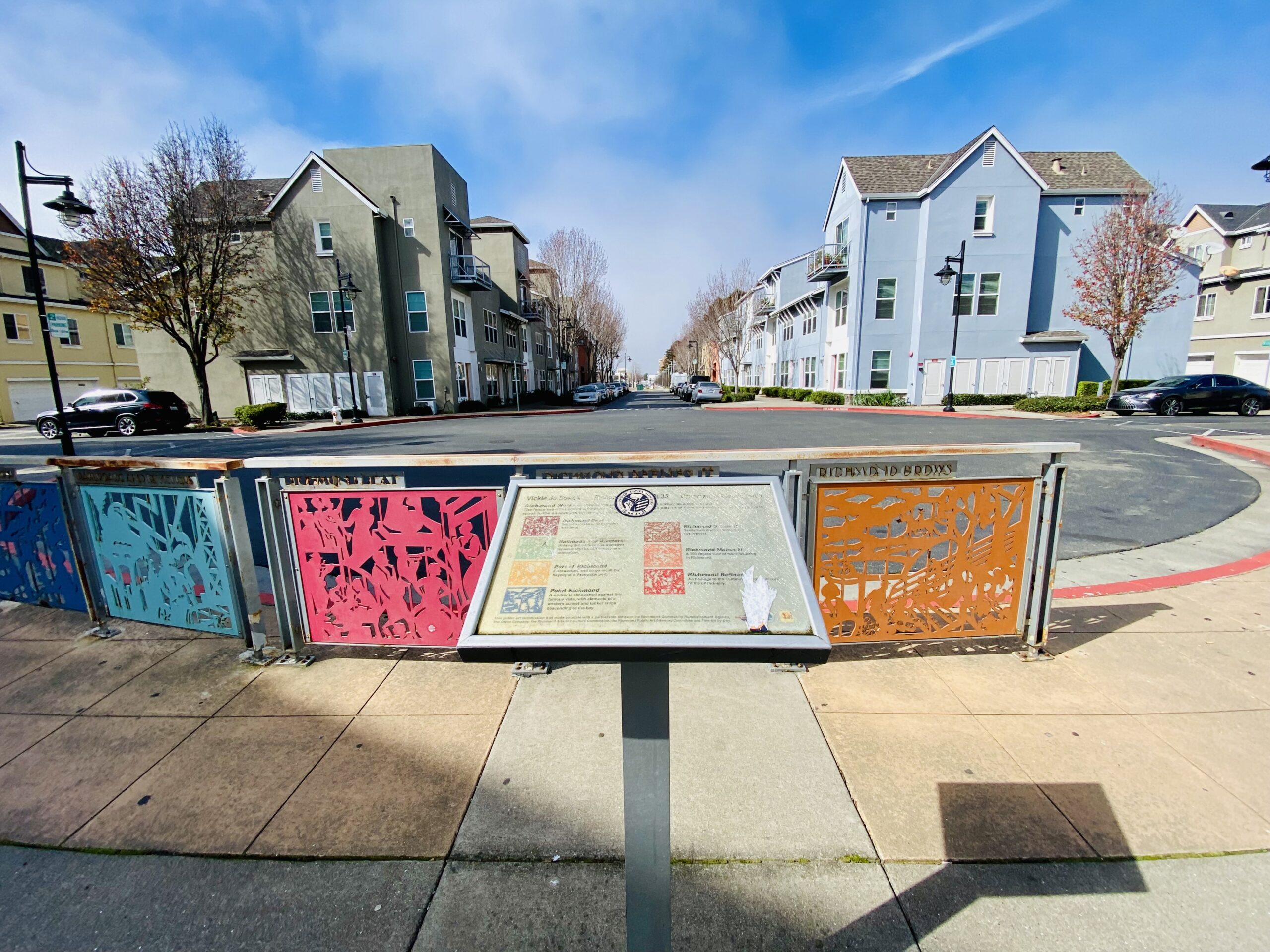 At the end of Nevin Plaza where the street meets the plaza, a colorful, artistic fence reflects the city’s history in its design, from Point Richmond to “railroads and riveters,” to the “Richmond beat” blues and jazz scene, to Chevron Richmond jobs and more. It offers the first hint of an abundance of art to enjoy along the way.