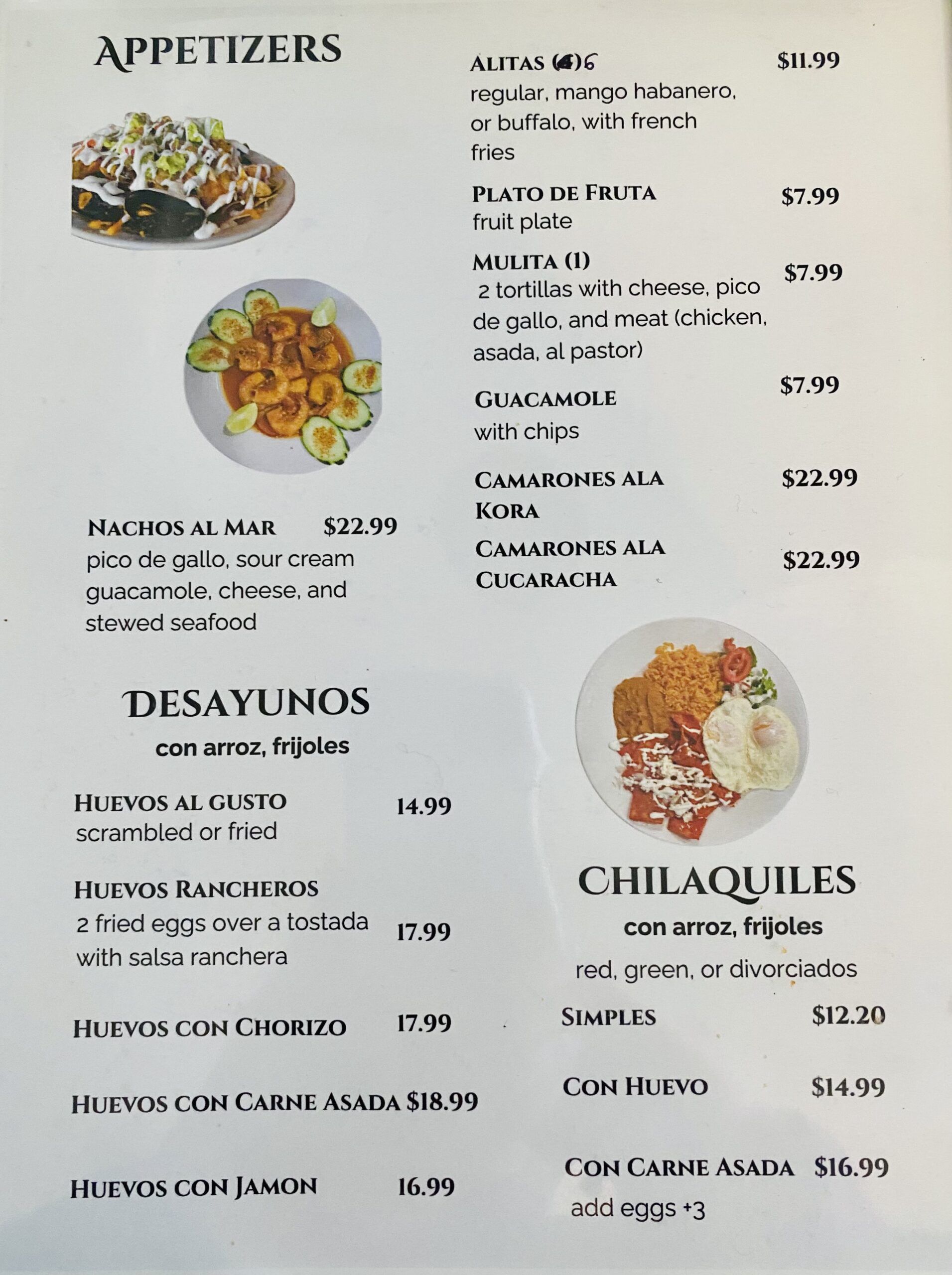 As for Roberto, his favorite dishes at Mariscos Los Reyes are the Torre de Mariscos and the Molcajete. The manager said that the restaurant’s busiest times are Friday through Sunday, when it’s filled with a lot of regulars and new customers. Patrons can pony up to the bar or a table and watch sports, news and more on one of seven large screen TVs in the spacious bar/dining space.