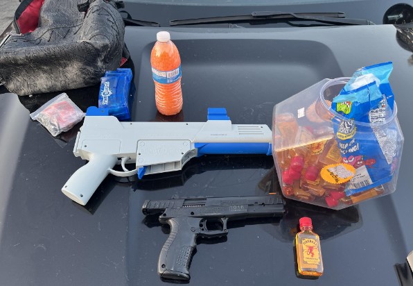 The suspects were located and apprehended. Police determined that two of them entered the store armed with Orbeez guns, shot gel balls at the clerk and stole alcohol before fleeing, police said.