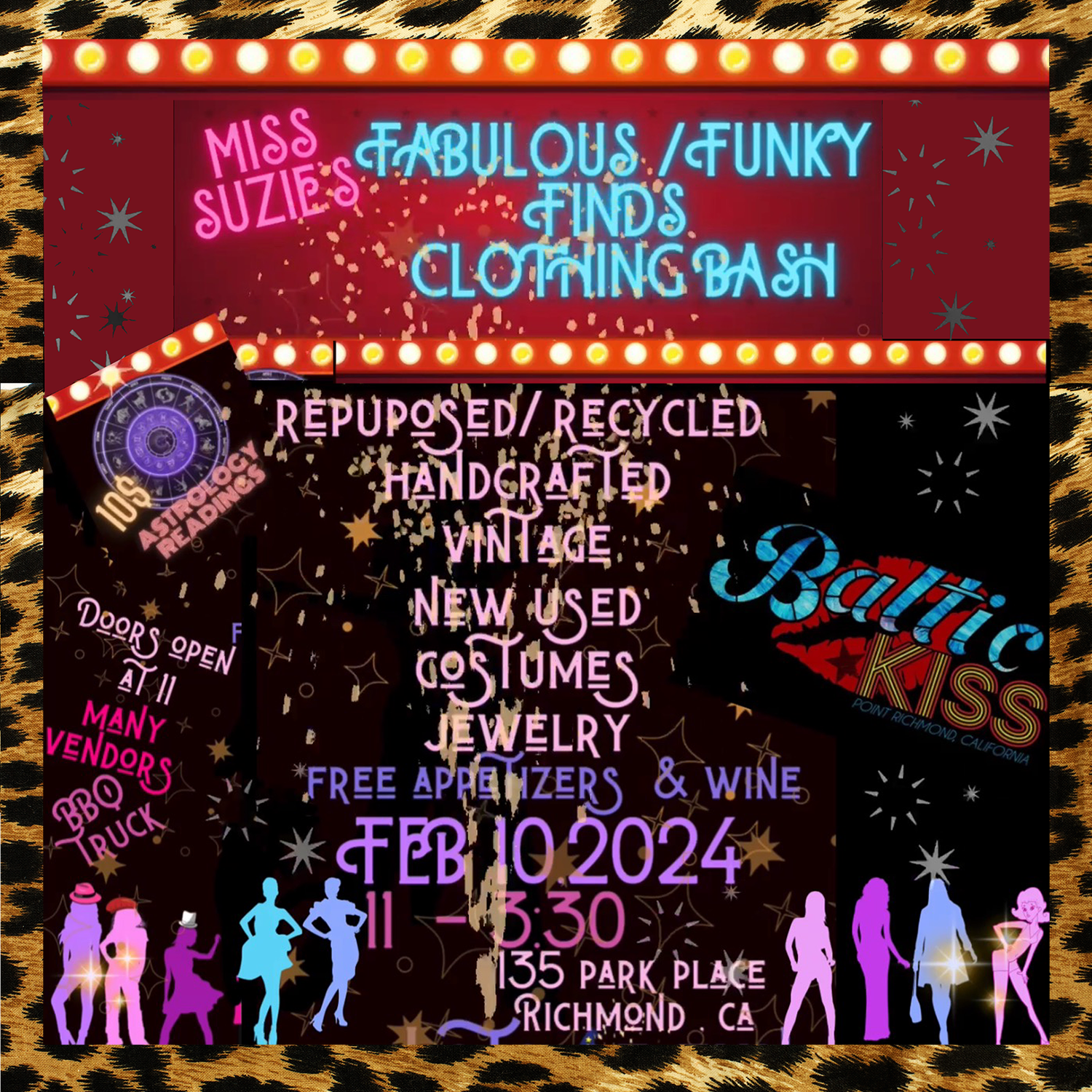 Find Miss Suzie’s Fabulous Funky Finds Clothing Bash at Baltic Kiss, 135 Park Pl. in Point Richmond.