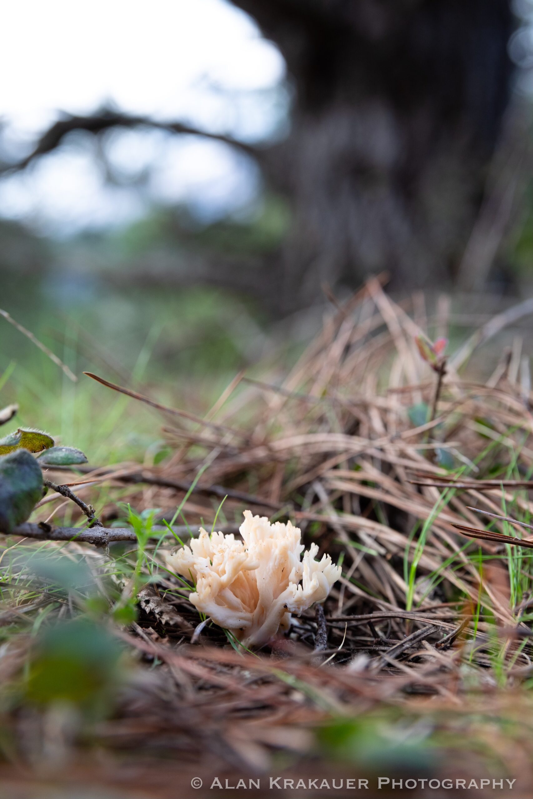 My hiking companion was generous in sharing his main destination for mushroom photography on the trail—the grove of Eucalyptus, pines and other trees preceding a bench with a literal birds-eye view of the bay and beyond. When we reached it, Krakauer deviated beyond the hilly path into the trees, discovering the largest concentration of various mushrooms on our hike. Often times he was seen getting the perfect shot by carefully brushing away pine needles, twigs and the like.