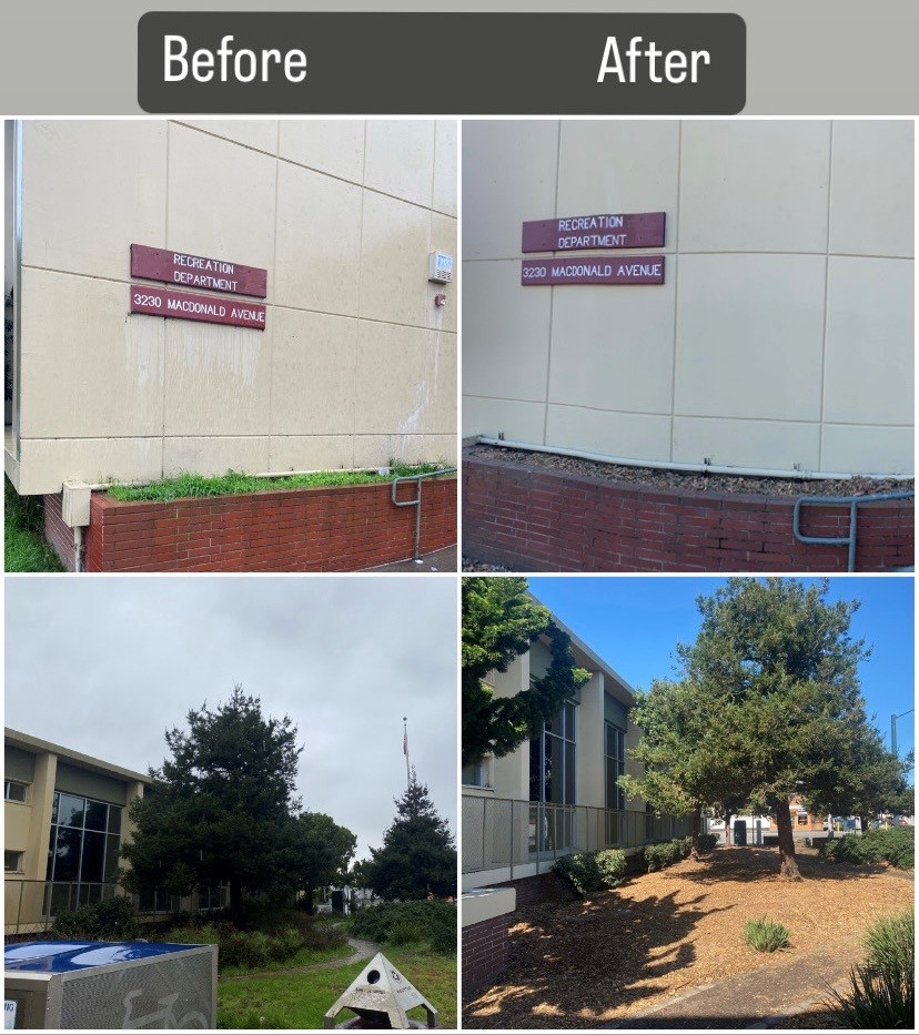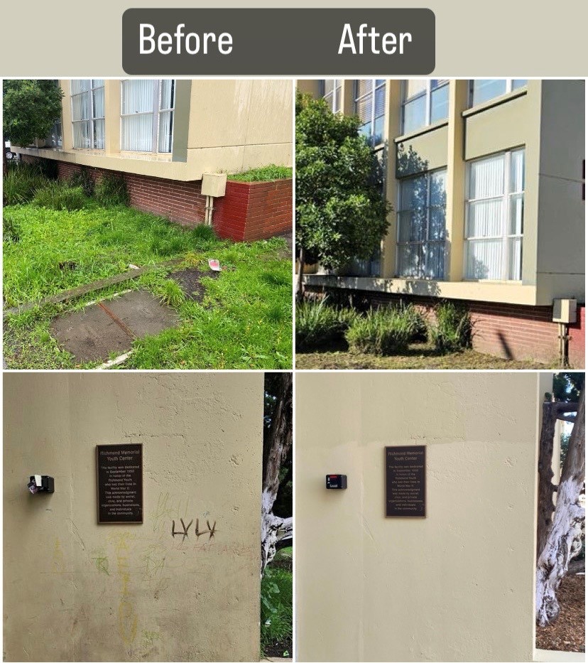 Volunteers and city staff removed litter and weeds, painted the building walls, installed weed fabric, and spread truckloads of mulch, according to city officials.