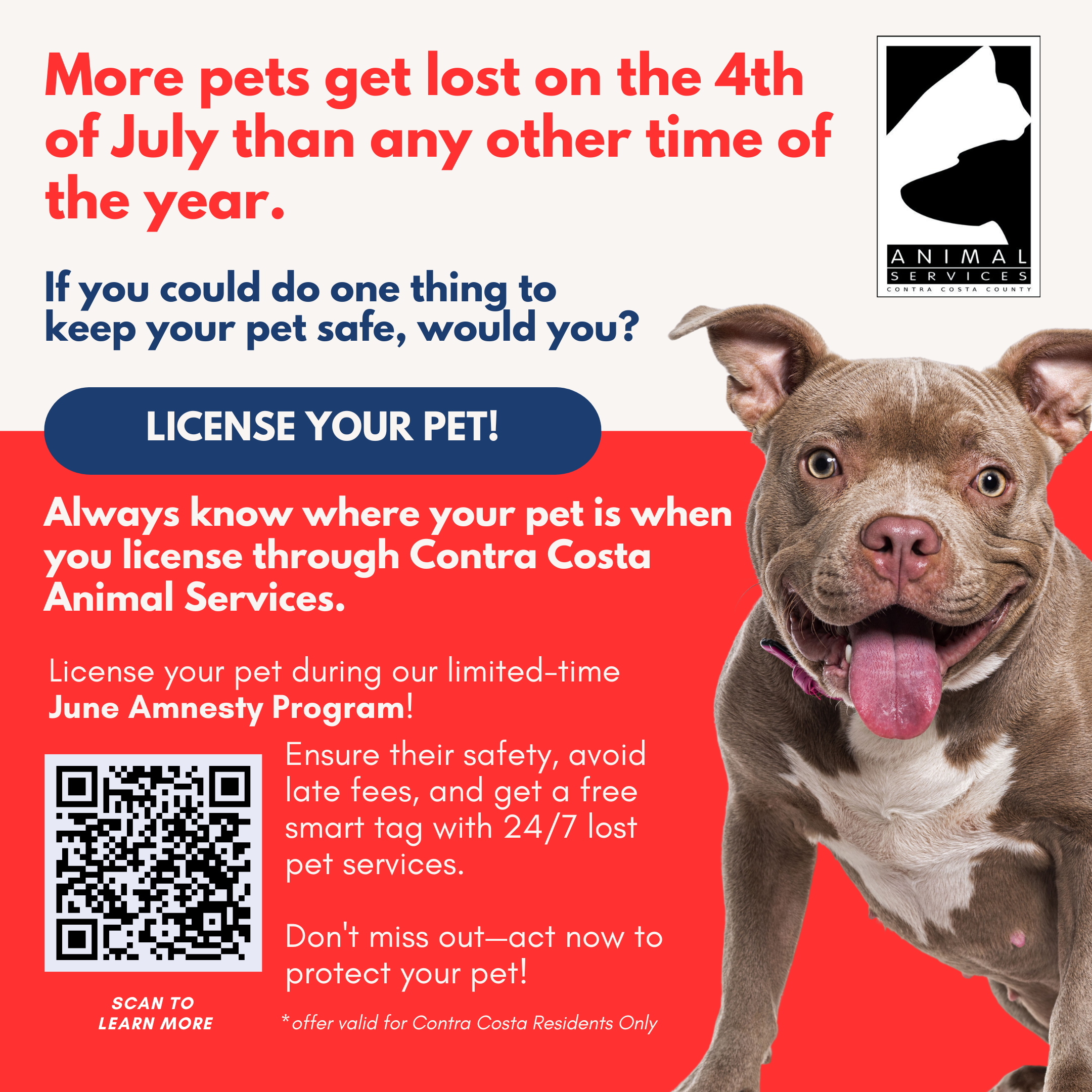 Throughout June, county residents with overdue animal licenses, or those who have never licensed their pets, will have all late and penalty fees waived, according to Contra Costa Animal Services (CCAS).