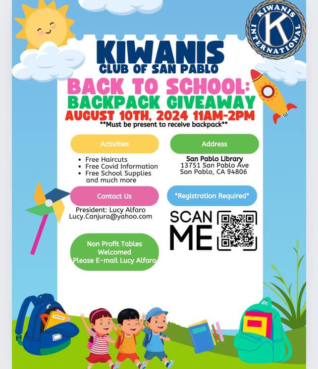 With local schools set to resume in August, the Kiwanis Club of San Pablo is letting the public know about its annual “Back to School Backpack Giveaway at the San Pablo Library.
