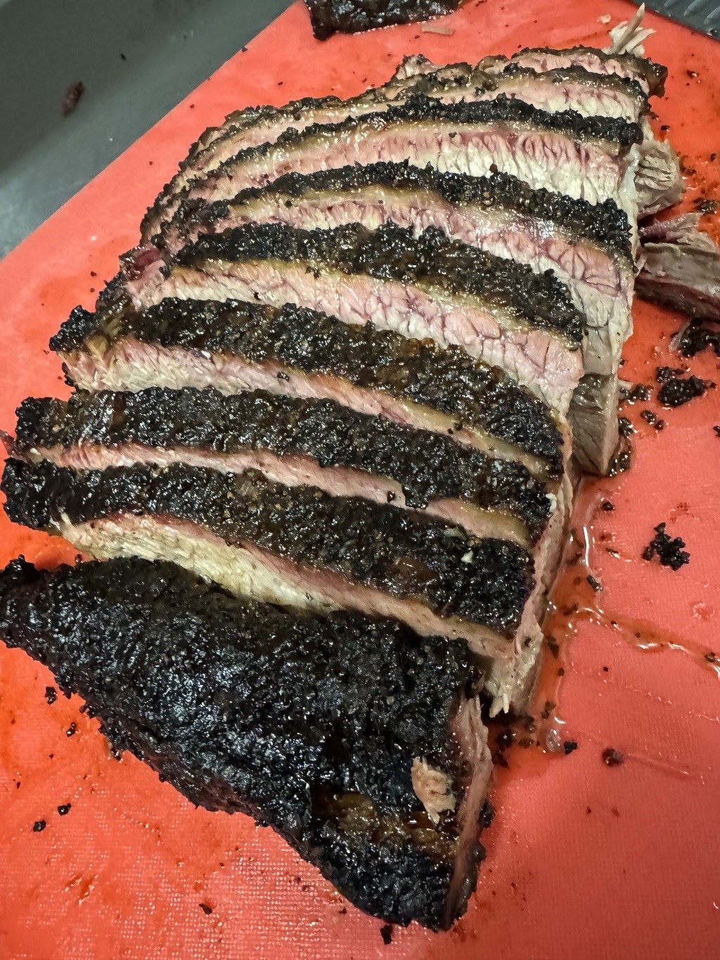 For brunch, the BBQ chef offers up the same meats and bakes croissants from scratch that can be ordered with egg for a breakfast sando. He also offers a croissket—his brisket with cheese folded into a croissant—and makes his own homemade bacon.