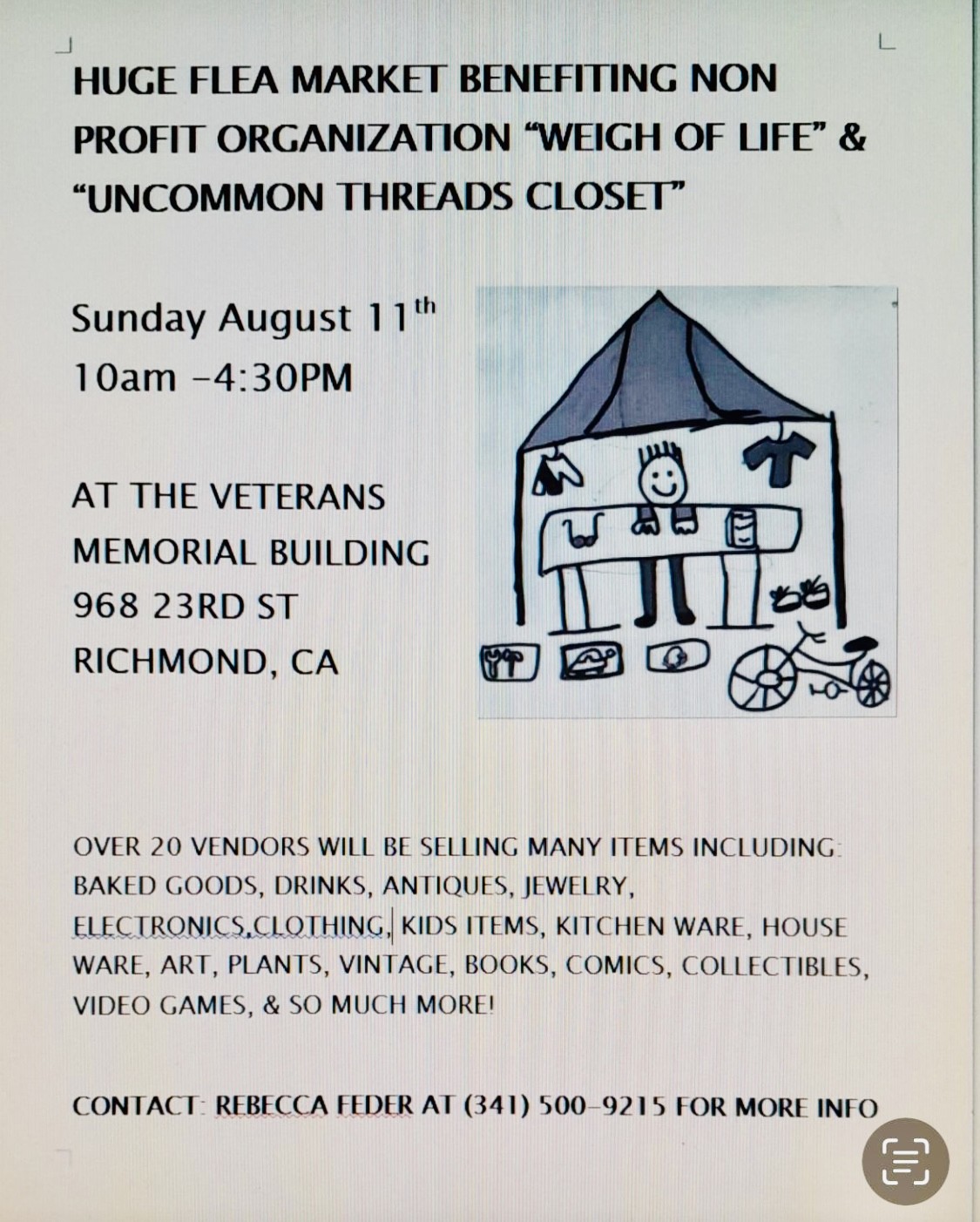Weigh of Life, a nonprofit exercise and nutrition organization helping people live healthy lives in West Contra Costa County, is hosting an indoor/outdoor “Flea Market” Sunday, Aug. 11 from 10 a.m. to 4:30 p.m. at the Veterans Memorial Hall in Richmond.
