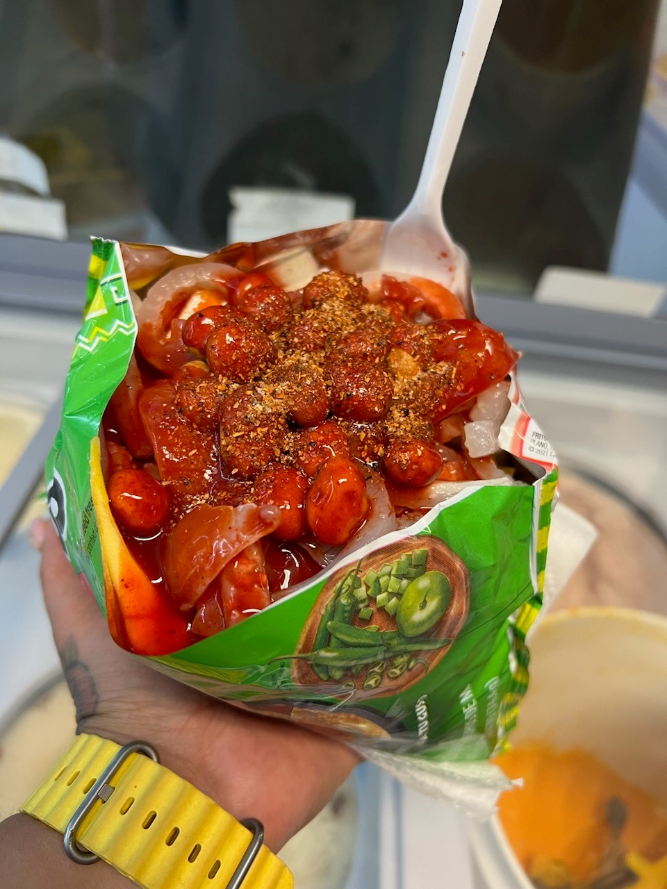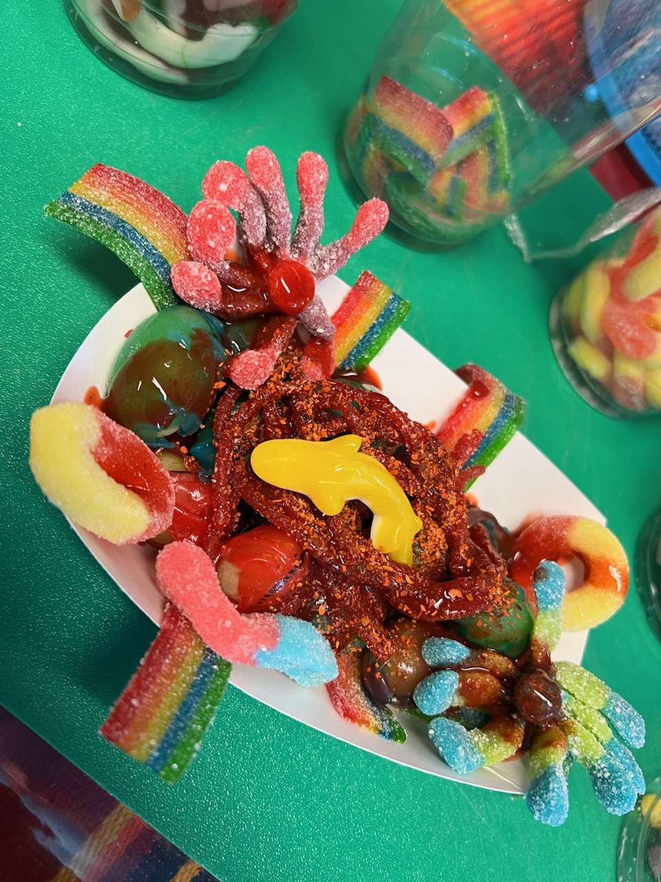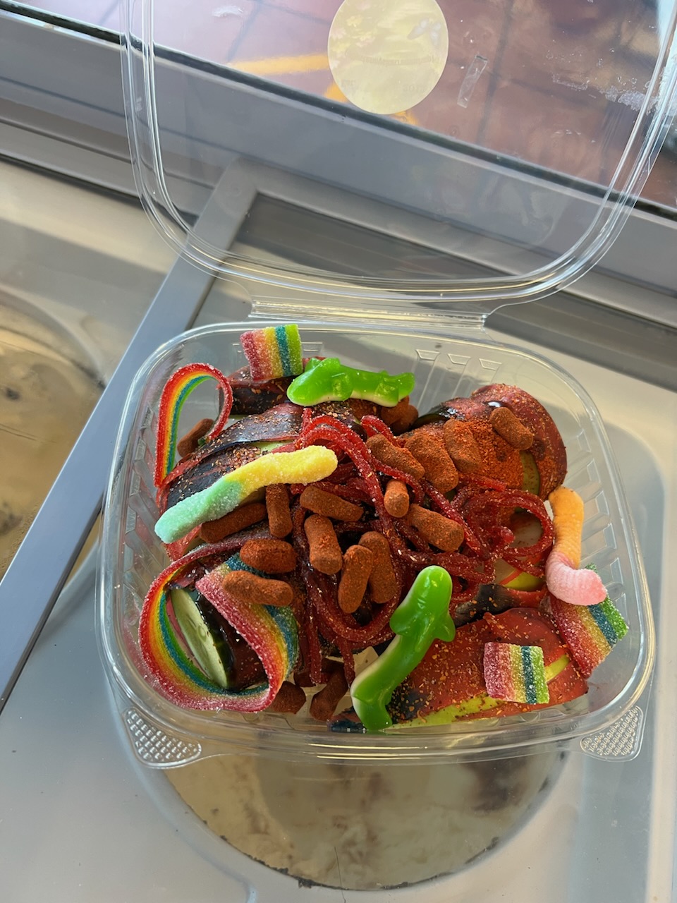 Another popular item is the Mangonada. It is made from shaved mango syrup and chamoy, which is made from pickled fruit. It is served sweet and sour and comes with a scoop of mango ice cream, with about a half dozen pieces of mangos on the side, and a piece of Tamarind candy.