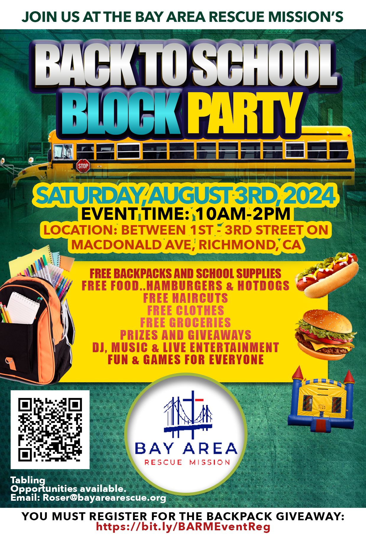 The Bay Area Rescue Mission’s annual “Back-to-School Block Party” is set for Saturday, Aug. 3 from 10 a.m. to 2 p.m. on Macdonald Ave. between First and Third Streets in Richmond.