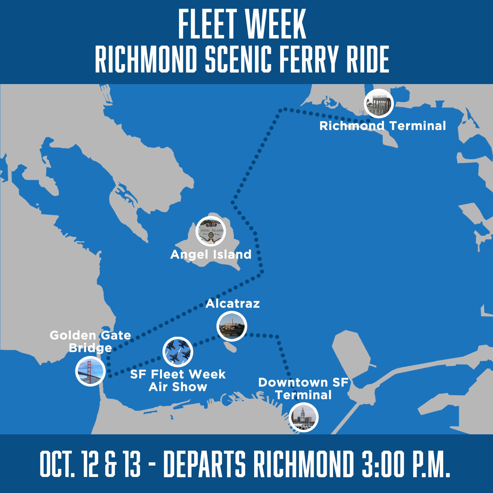 Fancy a ferry ride across the bay? San Francisco Bay Ferry is making the ride more scenic than ever with the special “Richmond Scenic” trip Saturday, Oct. 12 and Sunday, Oct. 13, leaving from the Richmond Ferry Terminal at 3 p.m.