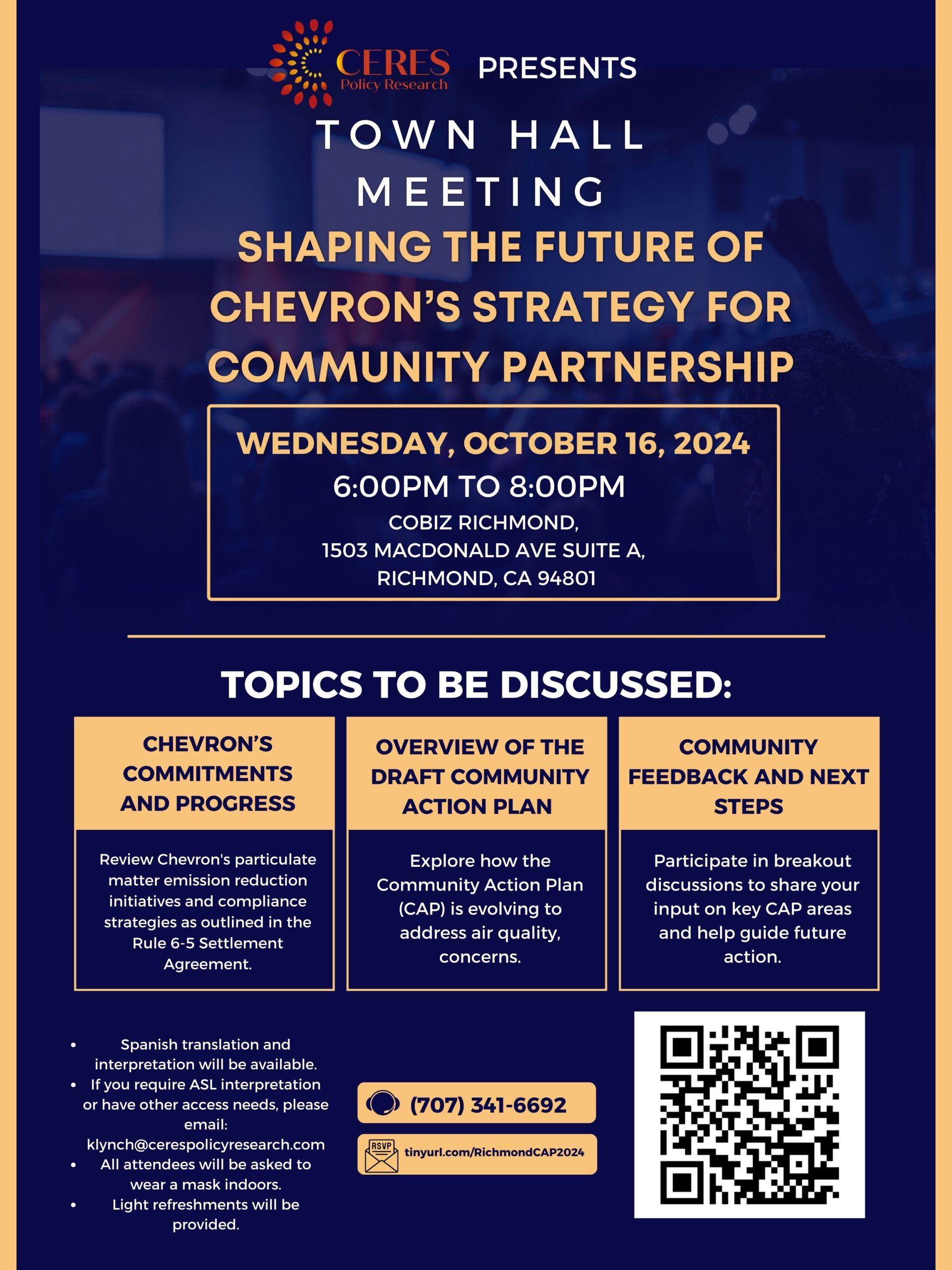 This will be an opportunity for residents, local leaders and environmental advocates to assemble and provide feedback on the Community Action Plan (CAP). The CAP was developed in response to Chevron’s settlement with the Bay Area Air Quality Management District (BAAQMD) in February 2024, and will help shape how Chevron shares information with the community in the future.
