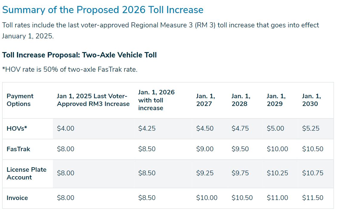 The Bay Area Toll Authority (BATA) is considering a proposed toll increase of $2.50 that would be phased in over five years, starting off with a 50 cent increase on Jan. 1, 2026.