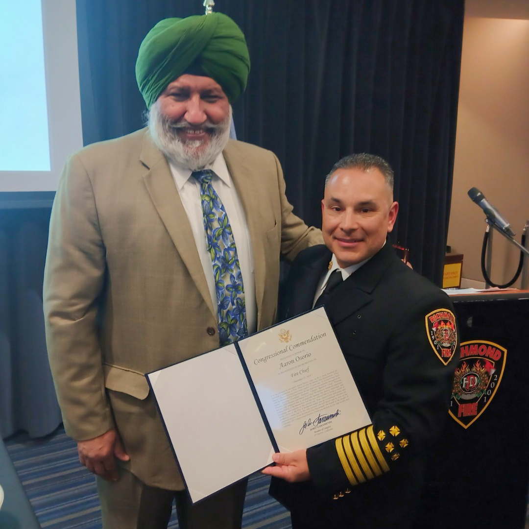 Harpreet Sandhu, field representative for Congressmember John Garamendi, presented the chief with a Congressional Commendation, citing his 23 years of serving in the fire service in Richmond in numerous positions.