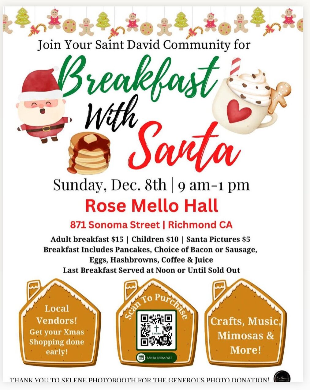 Local vendors will offer an opportunity to shop for unique holiday gifts. Also enjoy crafts, music, mimosas and more. Scan the barcode in the flyer to purchase breakfast, which will be served until noon or until the food has sold out.