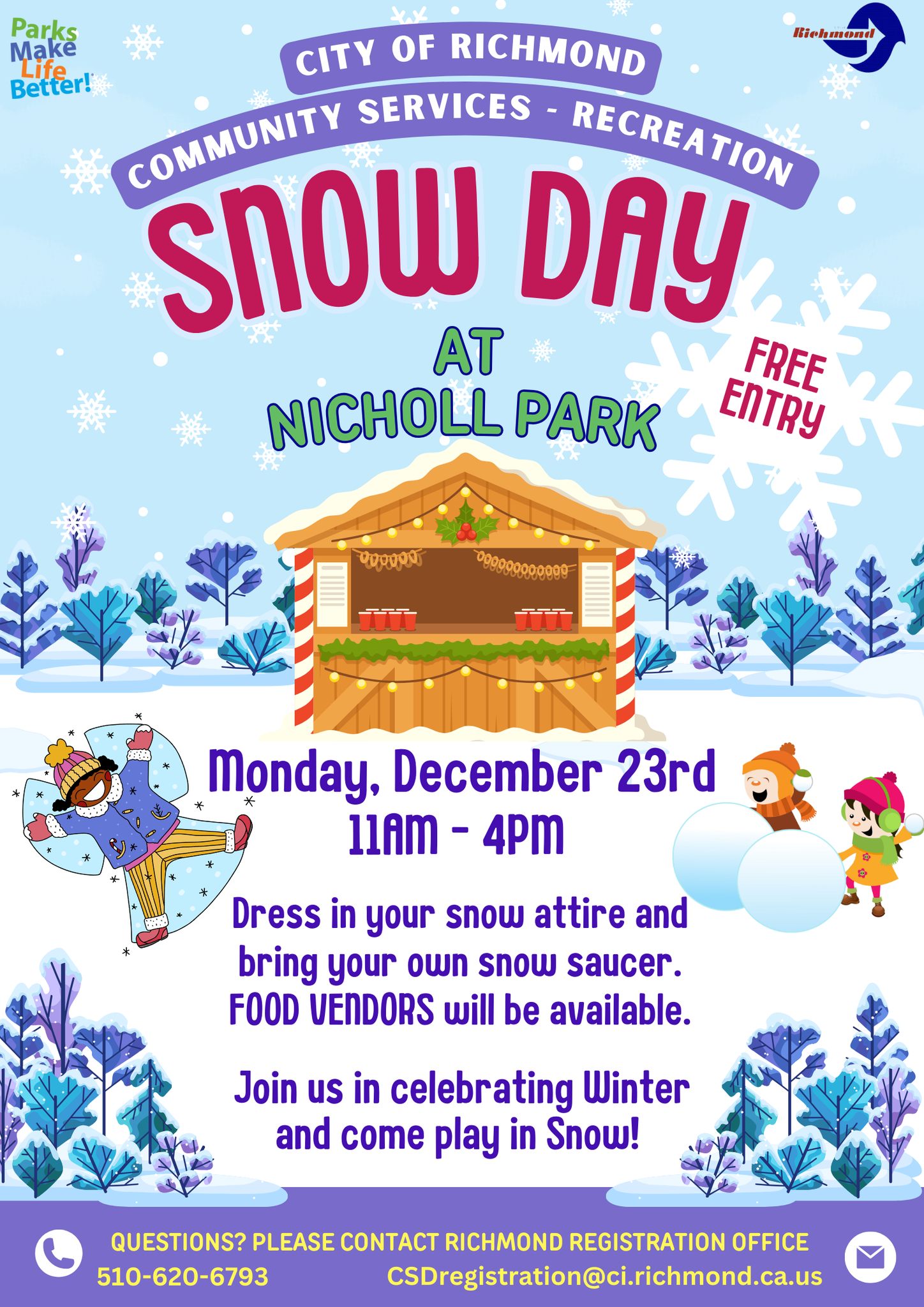 The City of Richmond, Community Services-Recreation invites the community to the 3rd Annual Snow Day at Nicholl Park.