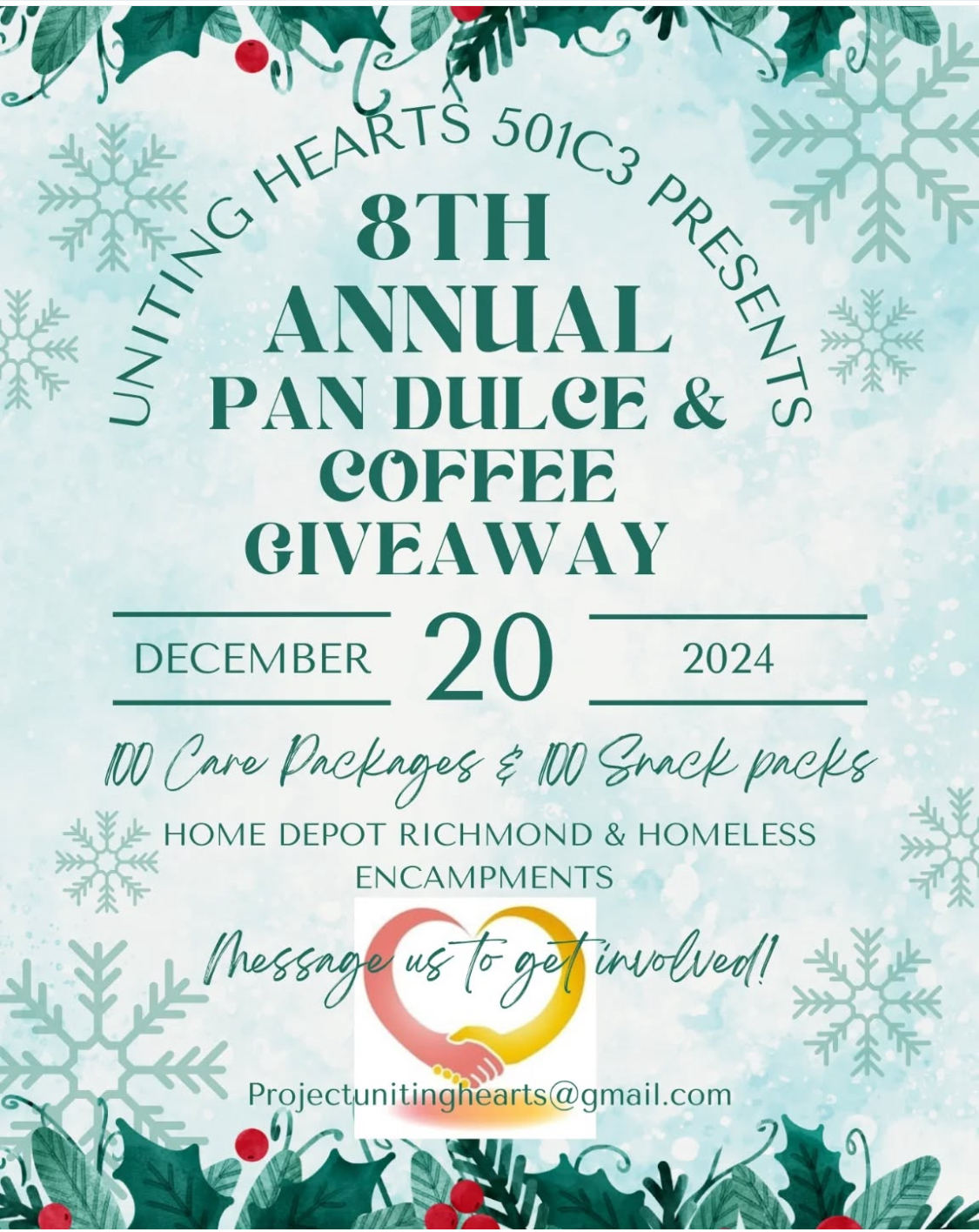 Day laborers and unhoused workers around Richmond will receive season’s greetings via 100 care packages, snack packs, pan dulce and coffee at the Uniting Hearts giveaway at Home Depot and homeless encampments Friday, Dec. 20.