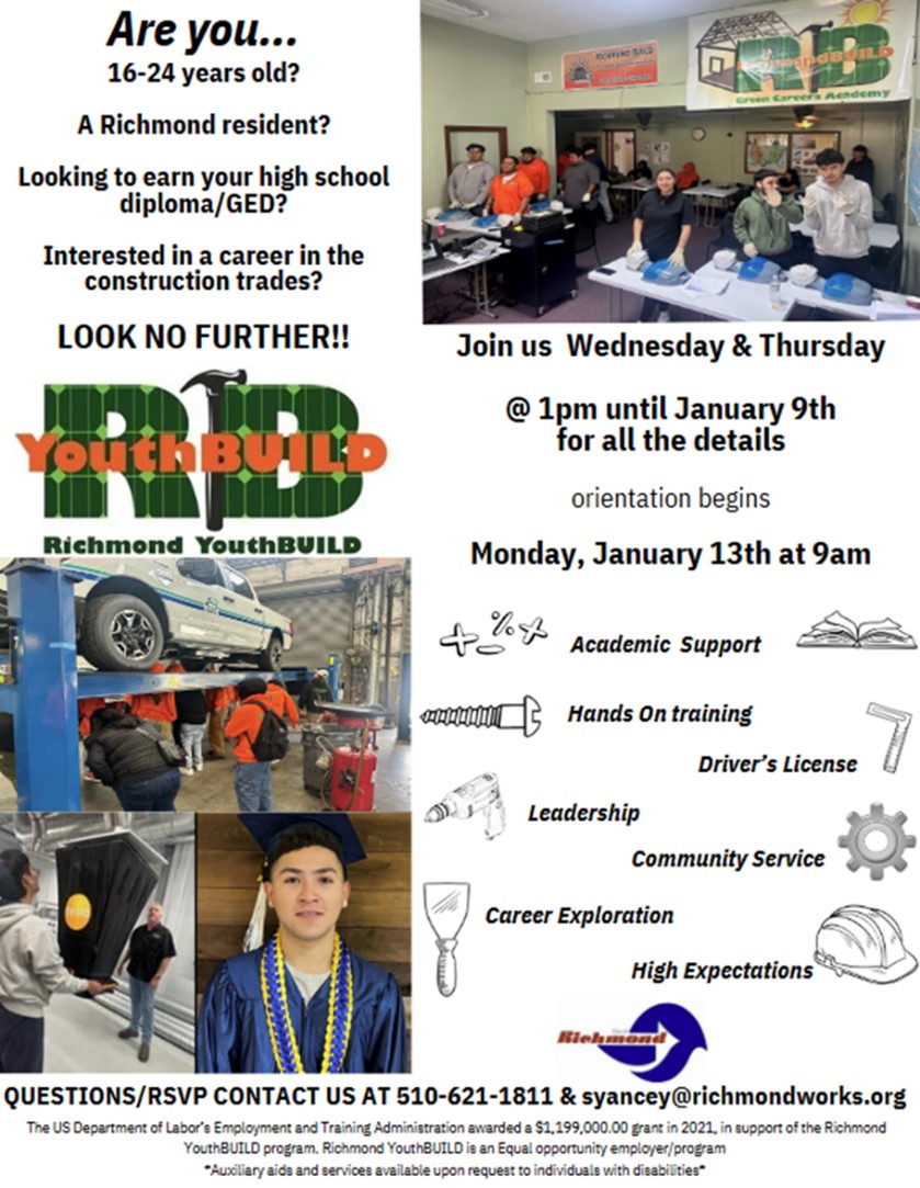 Richmond YouthBUILD—a City program offering pre-apprenticeship training in construction, support to earn a high school diploma or GED and to launch a career—is accepting sign-ups for its orientation Monday, Jan. 13 at 9 a.m. Prospective students/trainees can join Richmond YouthBUILD Wednesdays and Thursdays at 1 p.m. until Jan. 9 to get advance details on the program.