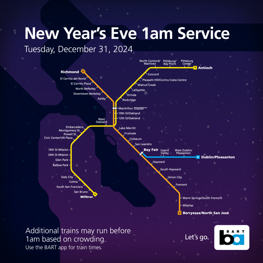 BART will run special extended service on New Year’s Eve until 1 a.m. Then on Jan. 1, BART will run a Sunday schedule from 8 a.m. to midnight.