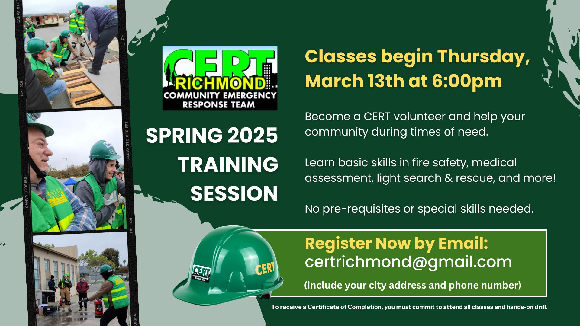 Richmond community members are encouraged to participate in the Spring 2025 Community Emergency Response Team (CERT) Academy, where they will learn basic skills in fire safety, medical assessment, light search and rescue and more.