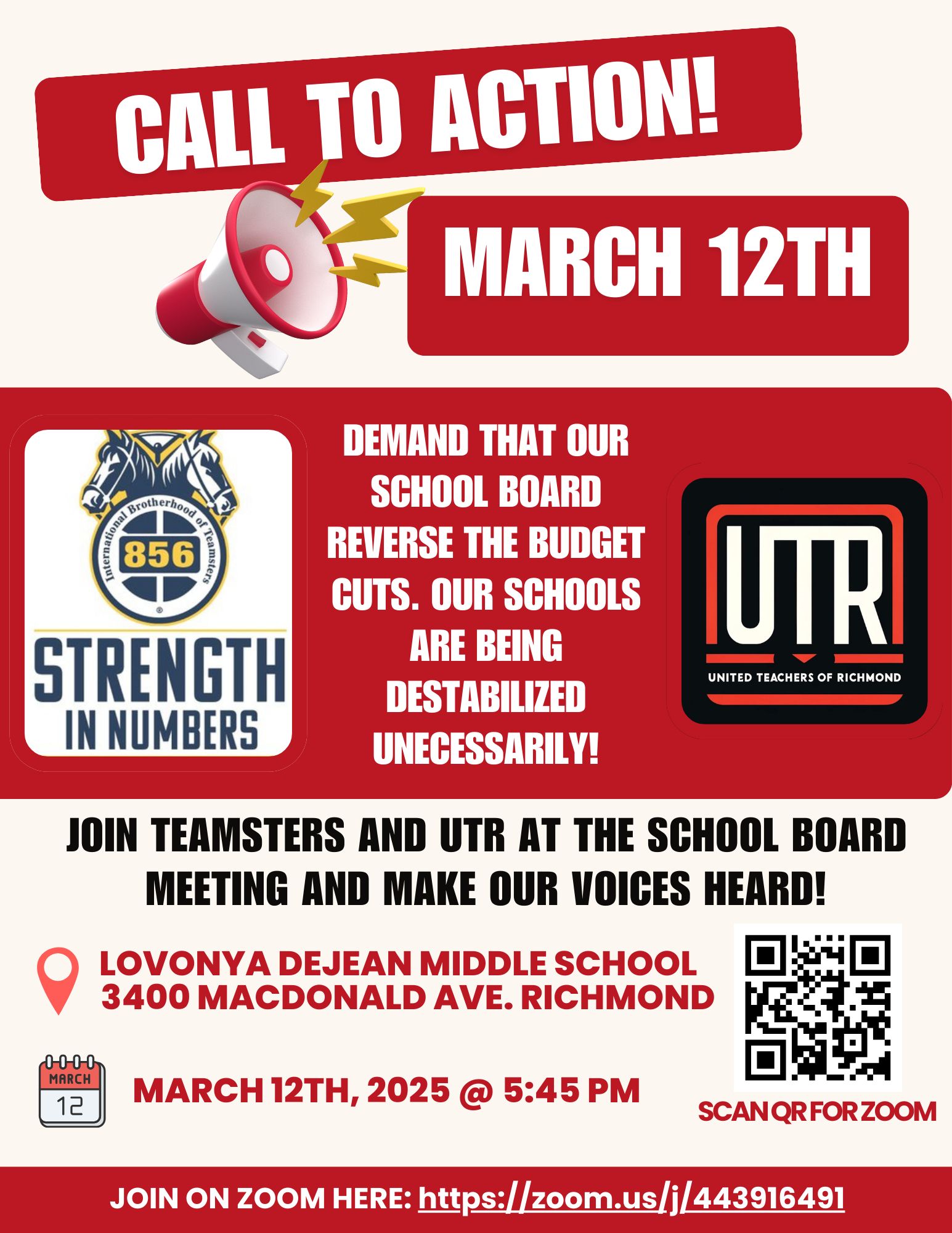 In a separate action Wednesday evening, the United Teachers of Richmond (UTR) and the International Brotherhood of Teachers will join forces to make their voices heard at the school board meeting, which starts at 5:45 p.m. at DeJean Middle School at 3400 Macdonald Ave. in Richmond.