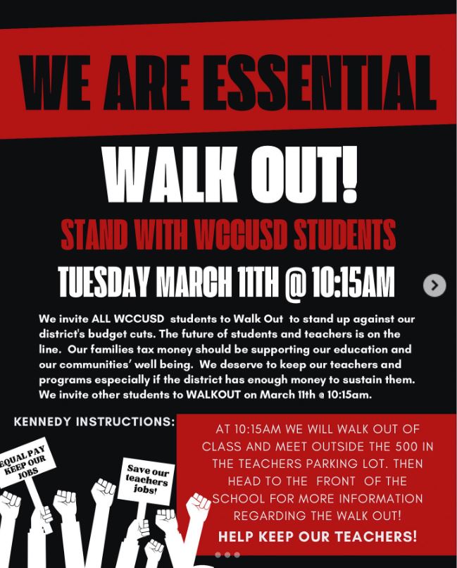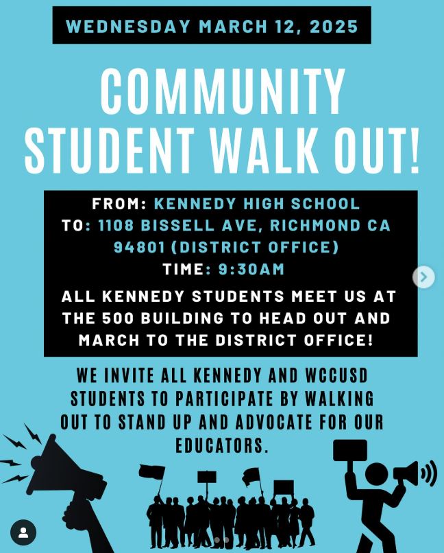 One flyer from the Kennedy High Leadership Instagram account encouraged students to walk out at 9:30 a.m. on Tuesday. A separate flyer on the same page encourages students to walk out at 10:15 a.m. on Wednesday. In both cases, students are asked to meet at the 500 Building (in the teachers parking lot). The flyer for the Wednesday event states students will march from Kennedy High to the district office at 1108 Bissell Ave.