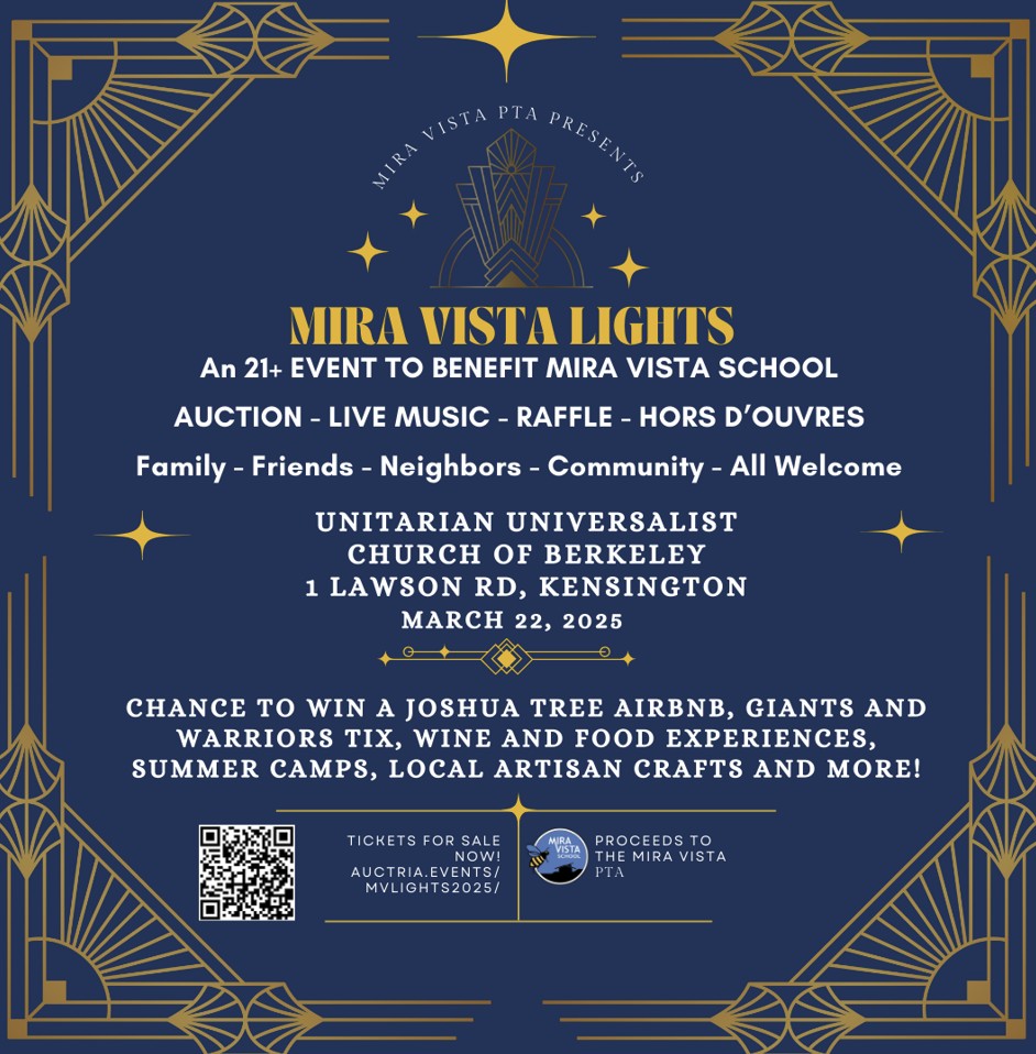 “Mira Vista Lights,” a gala hosted by Mira Vista Elementary’s PTA, will raise key funds for it on March 22 at 6:30 p.m. at the Unitarian Universalist Church of Berkeley. All (21+) are welcome to attend.