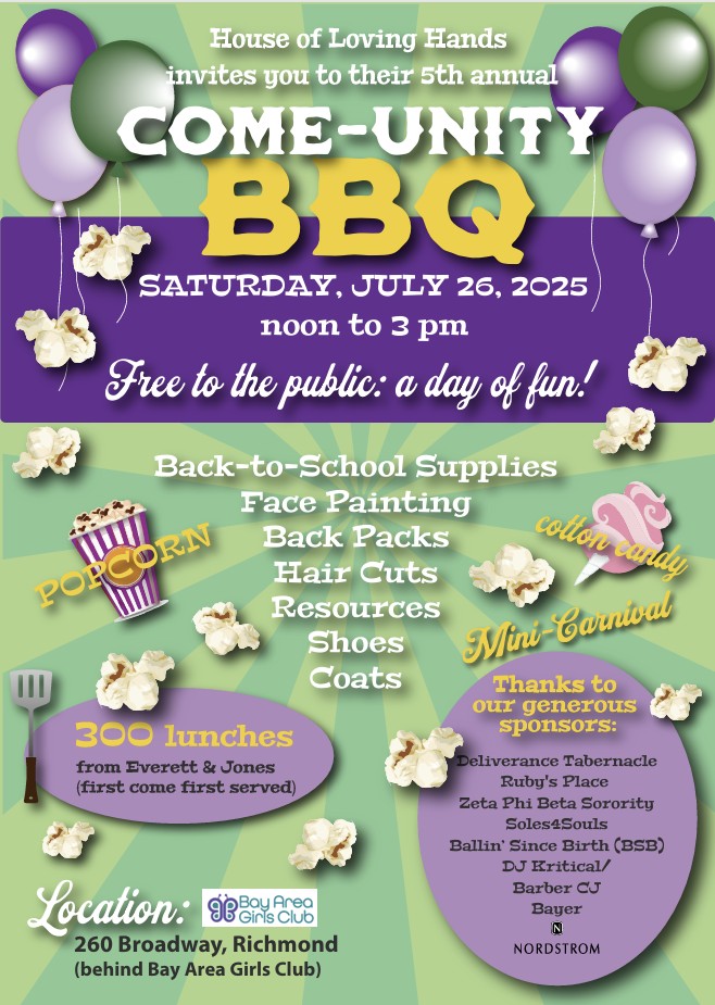 The Come-Unity BBQ can be found at 260 Broadway in Richmond (behind the Bay Area Girls Club). Learn more about House of Loving Hands or contact the nonprofit at [email protected].