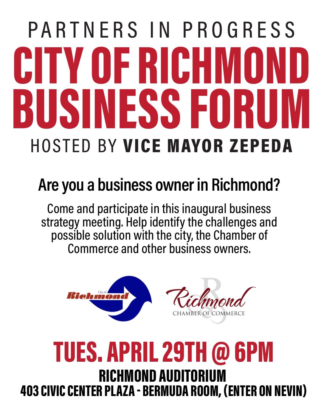 The City of Richmond is calling on business owners to participate in its inaugural “Business Forum” Tuesday, April 29 at 6 p.m. at the Richmond Auditorium.