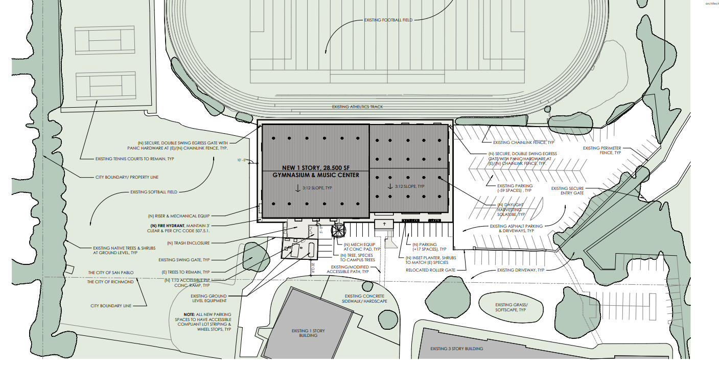 Salesian College Preparatory received unanimous Planning Commission approval to construct a 28,500-square-foot gymnasium and music center on the school’s campus at 2851 Salesian Ave. in San Pablo. The commission approved a major design review and a conditional use permit for the project.