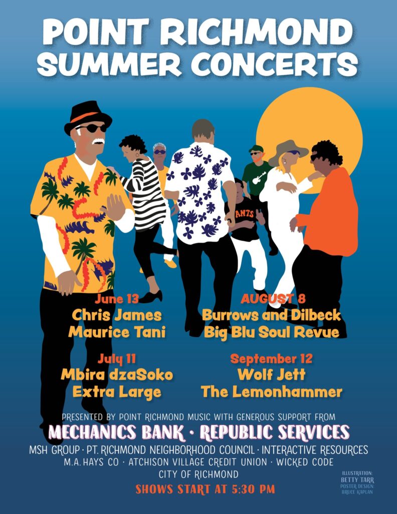 Sponsors for this year’s music series include Republic Services, Mechanics Bank, Point Richmond Neighborhood Council, MSH Group, M.A. Hays, Atchison Village Credit Union, East Brother Beer and Wicked Code.