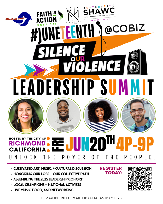 The City of Richmond, Restorative Safety Health and Wellness Council (SHAWC) and Faith In Action East Bay are collaborating to host a free-admission “Juneteenth Silence Our Violence Leadership Summit” Friday, June 20 from 4-9 p.m. at CoBiz Richmond.