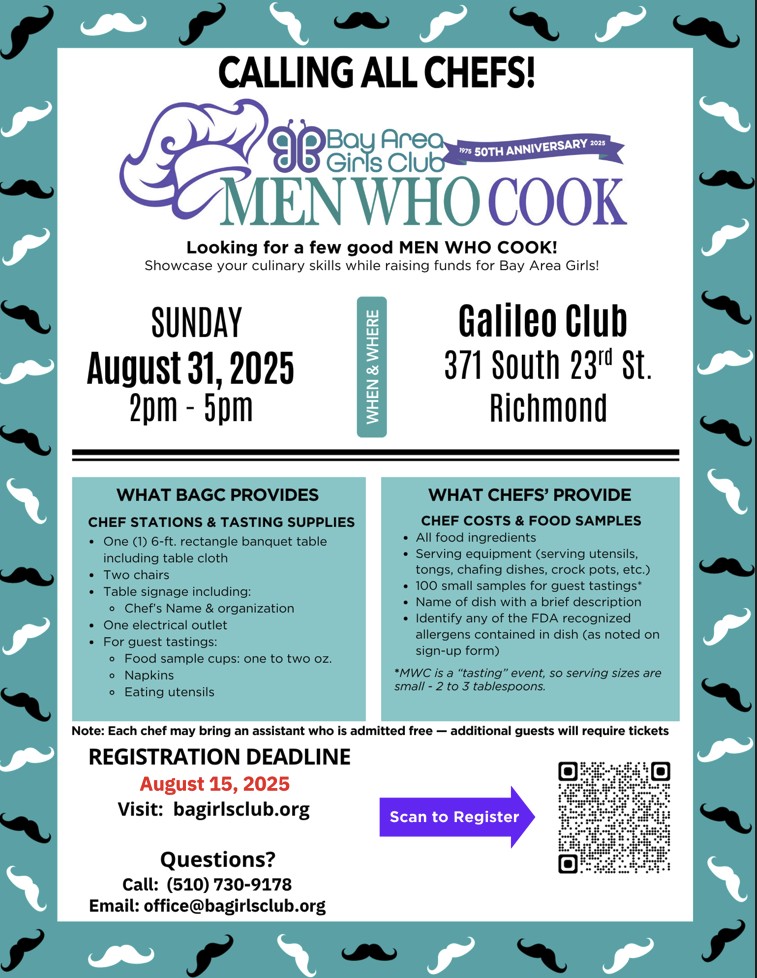 As the Bay Area Girls Club (BAGC) celebrates 50 years of empowering girls ages 5-18, chefs will be stepping up to support them via the “Men Who Cook” fundraiser Sunday, Aug. 31 from 2-5 p.m. at Richmond’s Galileo Club.