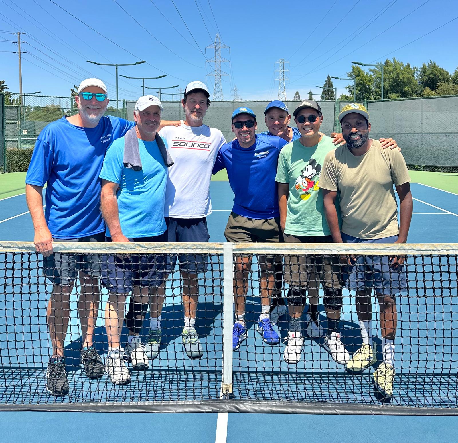 The 4.0 Men’s team earned their entry to the NORCAL Championships with an outstanding record of 8-2 in the East Bay League, playing against most of the same clubs as the 3.5 Men plus some others: San Pablo Park and Davie Stadium. They won their East Bay playoff matches versus Chabot and Claremont by the identical scores of 4-1 to earn their way to the Sacramento Championships. They came up against very strong competition on Friday against two teams, losing to the Bay Club of SF and Foster City. They rebounded against the Solano team on Saturday, winning 3-2. Against Solano’s champion, Centennial Park, they were tied 2-2 with Fernando Ramos, playing singles, battling a hard-hitting opponent and triple-digit temperatures. Just two years ago, Fernando was a 3.0 level player still learning the fundamentals of the game. Fernando has played over 800 league and practice matches since 2023, and his rapid rise has caught the attention of the United States Tennis Association, which moved him up to the 3.5 level at the end of 2023 and up to his current 4.0 level at the end of 2024. Fernando proved that he belonged at Sectionals, winning the deciding match 8-6 in a back-and-forth tiebreaker to send us all back to Richmond with our heads held high.