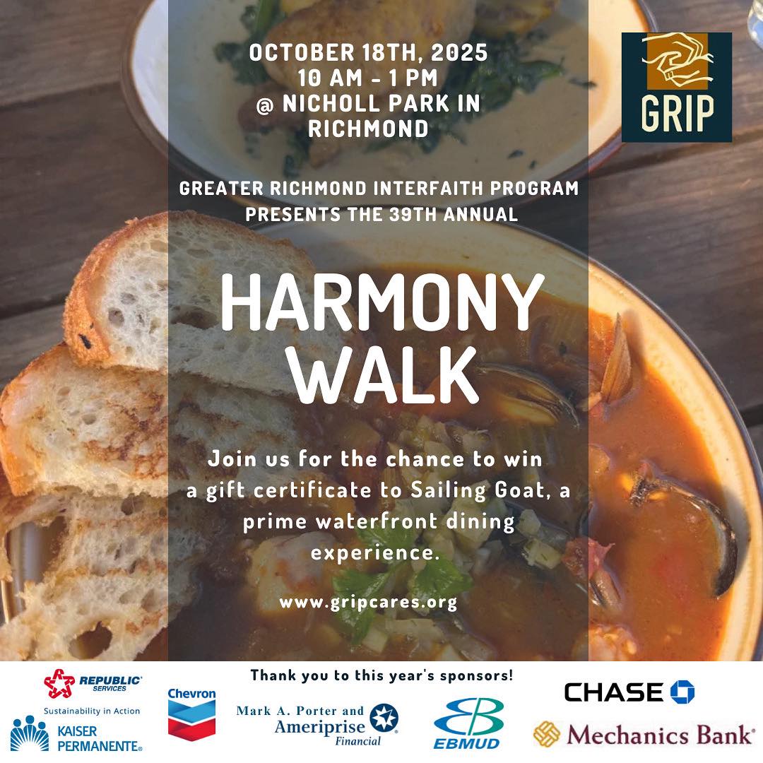 Major sponsors of the Harmony Walk include Mechanics Bank, Chevron, Kaiser Permanente, Republic Services, Mark A. Porter & Ameriprise Financial, East Bay MUD, and Chase. More sponsorship opportunities are available.