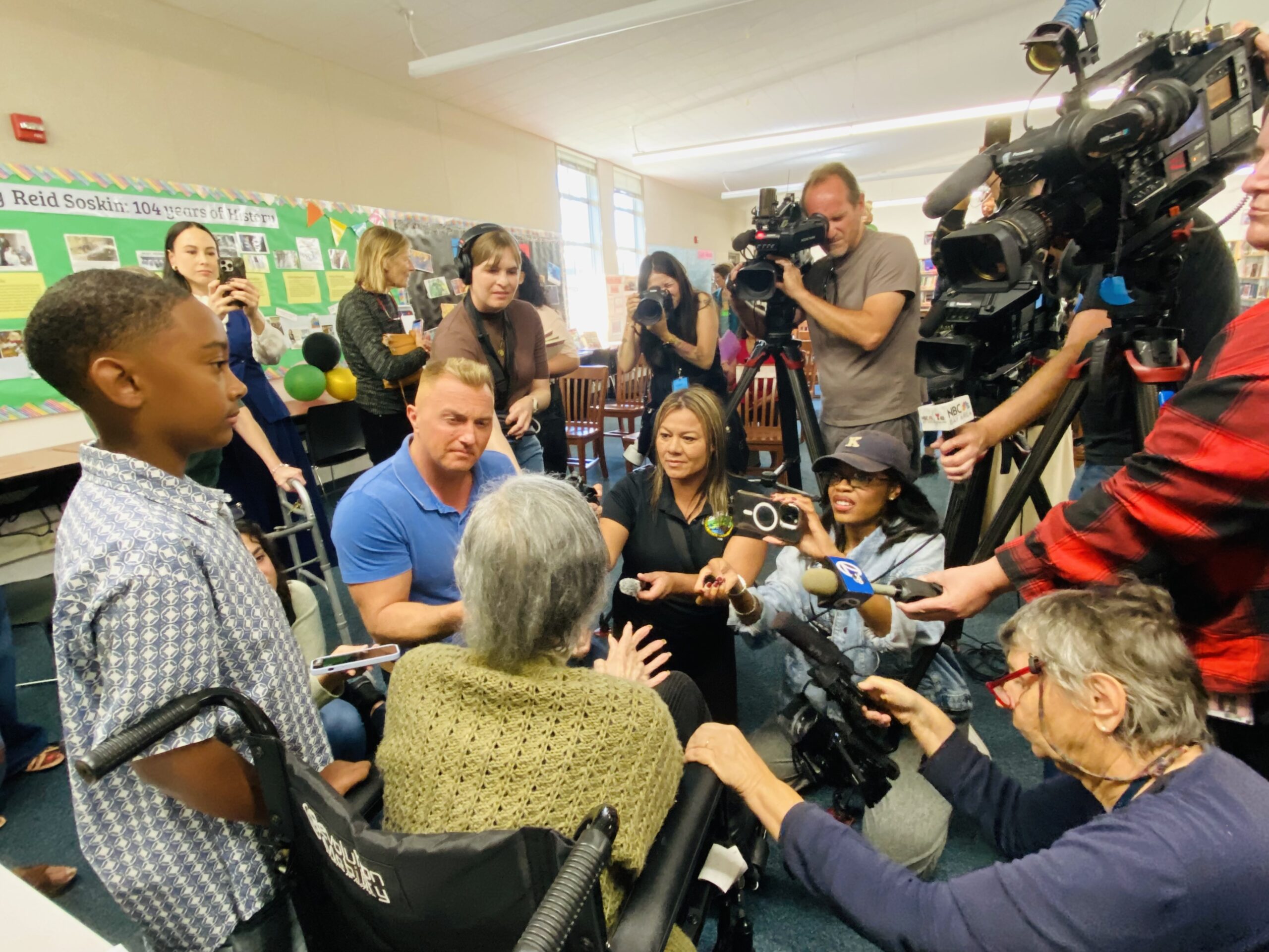 Family members rolled Ms. Betty outside in her wheelchair following her time in the library. At the school’s Quad, she was greeted by more than 400 students holding cheerful signs and singing ‘Happy Birthday’ to her.