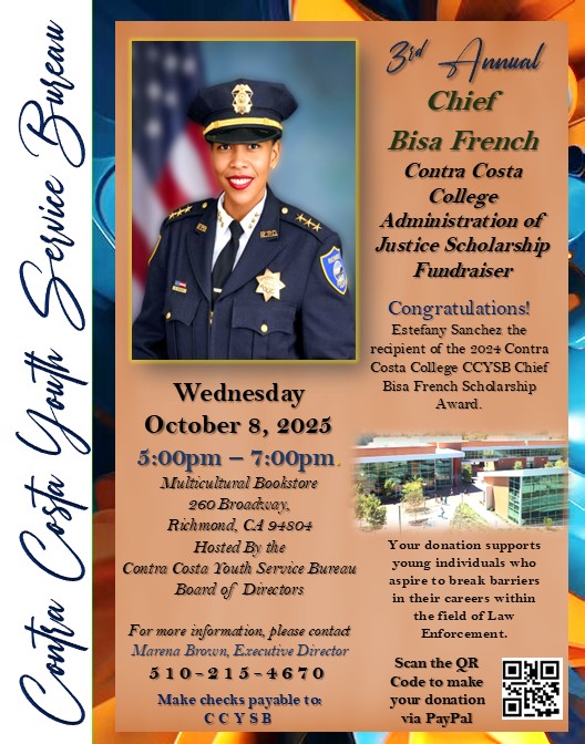 The “Chief Bisa French Contra Costa College Administration of Justice Scholarship Fundraiser” is set for Wednesday, Oct. 8 from 5-7 p.m. outside the Multicultural Bookstore. Admission is free and the fundraiser is open to anyone.