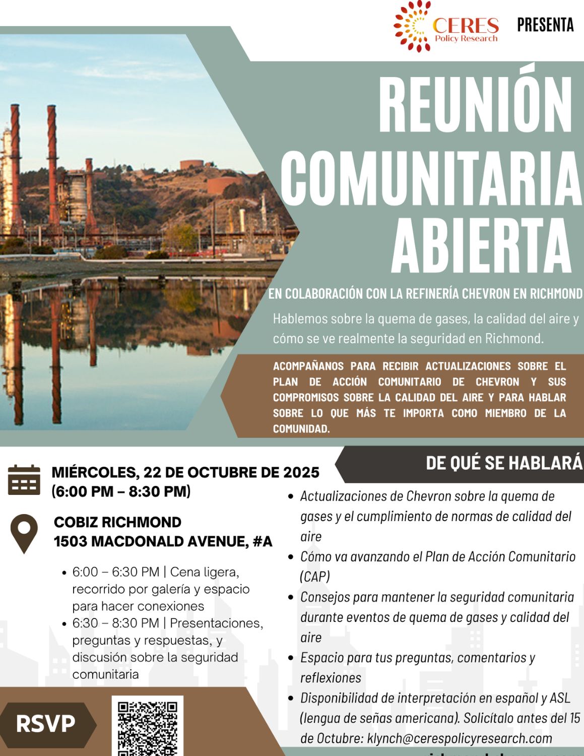 Organized by Ceres Policy Research in partnership with Chevron Richmond, the CAP Town Hall series aims to strengthen transparency, communication, and trust between the refinery and the local community. This upcoming session marks the third CAP event under the 2024 settlement agreement with the Bay Area Air District (BAAD).