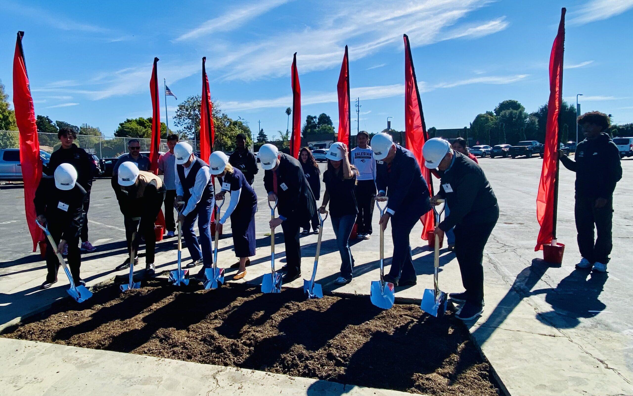 After the indoor program, attendees moved outside to the site of the future pavilion, where the student body surrounded the project’s perimeter. Father Mel Trinidad, provincial of the U.S. Western Province, offered a blessing for the project. The ceremony concluded with a symbolic groundbreaking, as the Oddos and other school dignitaries turned the first shovels of dirt, marking the official start of construction.
