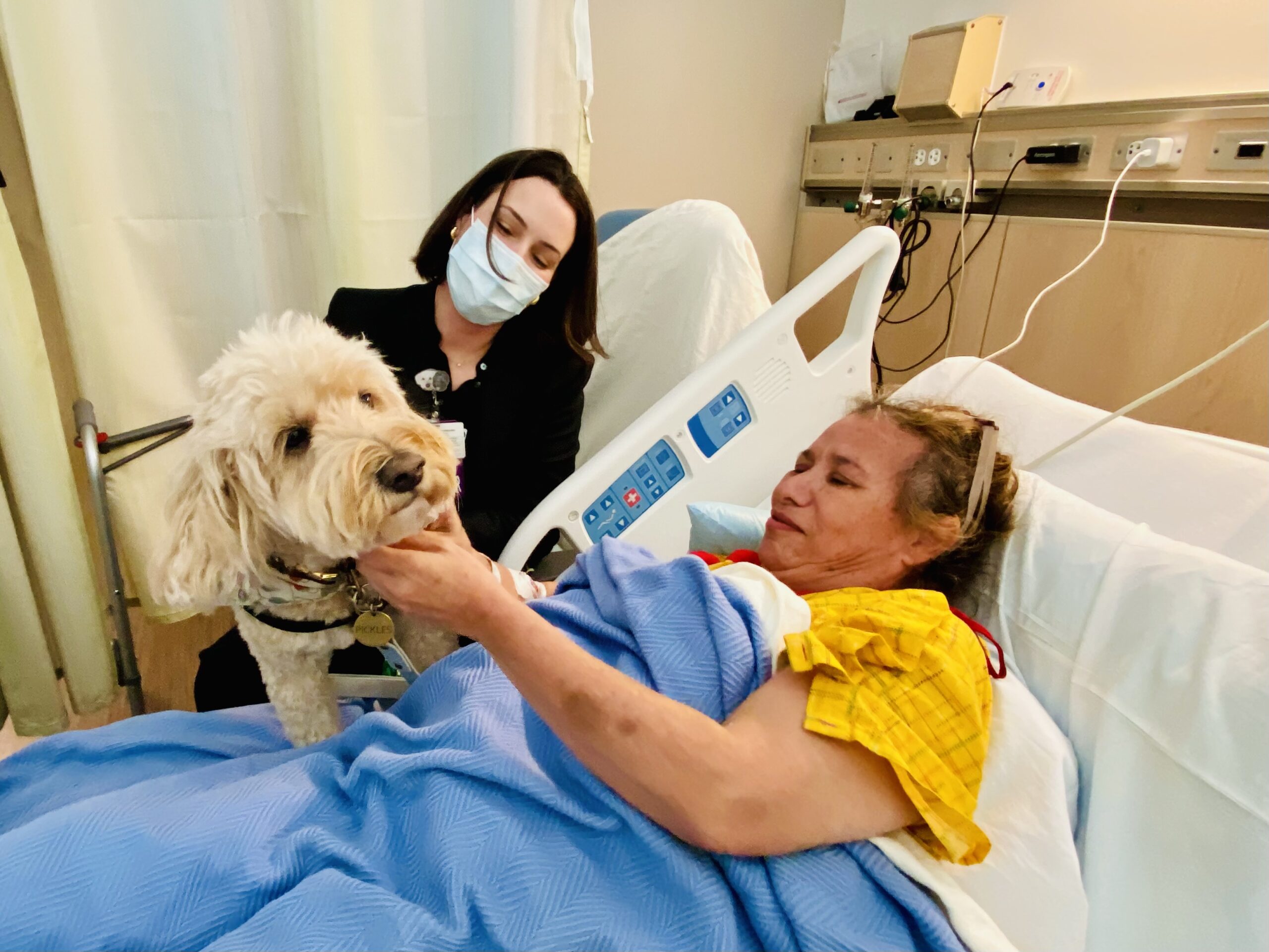 Kids often find it easier to open up around animals, expressing feelings they might not share with adults, noted Harrington. For adults, especially those facing difficult diagnoses or long recoveries, Pickles provides comfort and companionship. Walker recalled an early Pickles visit with a geriatric hospice patient. Although the patient was dying, Pickles brought delight to the dog-lover and her family.