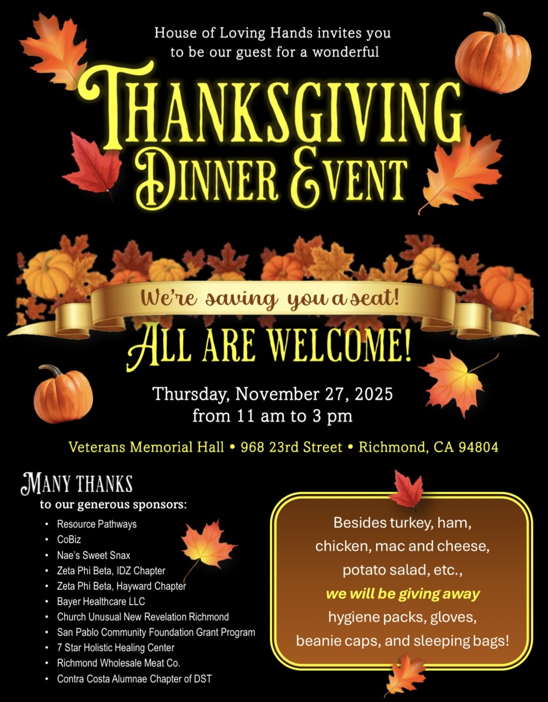 Find House of Loving Hands’ Thanksgiving Dinner Event at Veterans Memorial Hall, 968 23rd Street in Richmond. Questions? Contact (510) 730-1162 or [email protected].